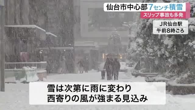 発達中の低気圧の影響で、14日の宮城県内は広い範囲で雪となり、仙台市中心部でも7センチの積雪を記録しました。雪の影響でスリップ事故も多発しています。