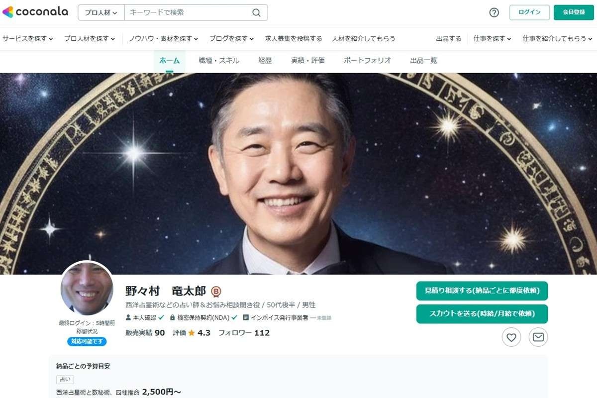 「野々村氏は昨年4月ごろ、知識やスキル、経験を売り買いできるサイト『ココナラ』に自身のページを立ち上げ、《西洋占星術と数秘術、四柱推命で占います》と銘打って、占いのサービスを販売しています。