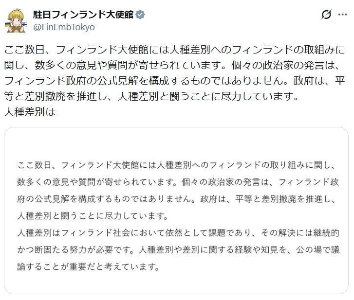 フィンランド大使館はXで「ここ数日、フィンランド大使館には人種差別へのフィンランドの取組みに関し、数多くの意見や質問が寄せられています。個々の政治家の発言は、フィンランド政府の公式見解を構成するものではありません。政府は、平等と差別撤廃を推進し、人種差別と闘うことに尽力しています」と表明。「人種差別はフィンランド社会において依然として課題であり、その解決には継続的かつ断固たる努力が必要です。人種差別や差別に関する経験や知見を、公の場で議論することが重要だと考えています」とした