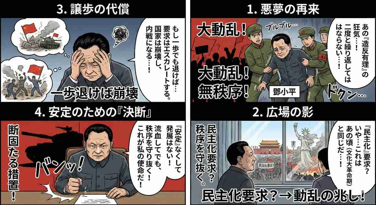 それは、かつて「造反有理」を叫んで党組織を破壊し、自身を失脚させ、息子を半身不随に追いやった紅衛兵の暴走と不気味なほどに重なり合っていたのである。彼にとって、掲げられたスローガンが「毛沢東万歳」であろうと「民主化万歳」であろうと本質的な違いはなかった。大衆が党の権威を超えて秩序を破壊し、国家を無政府状態に陥れる現象そのものが、忌むべき悪夢の再来として立ち現れたのだった。