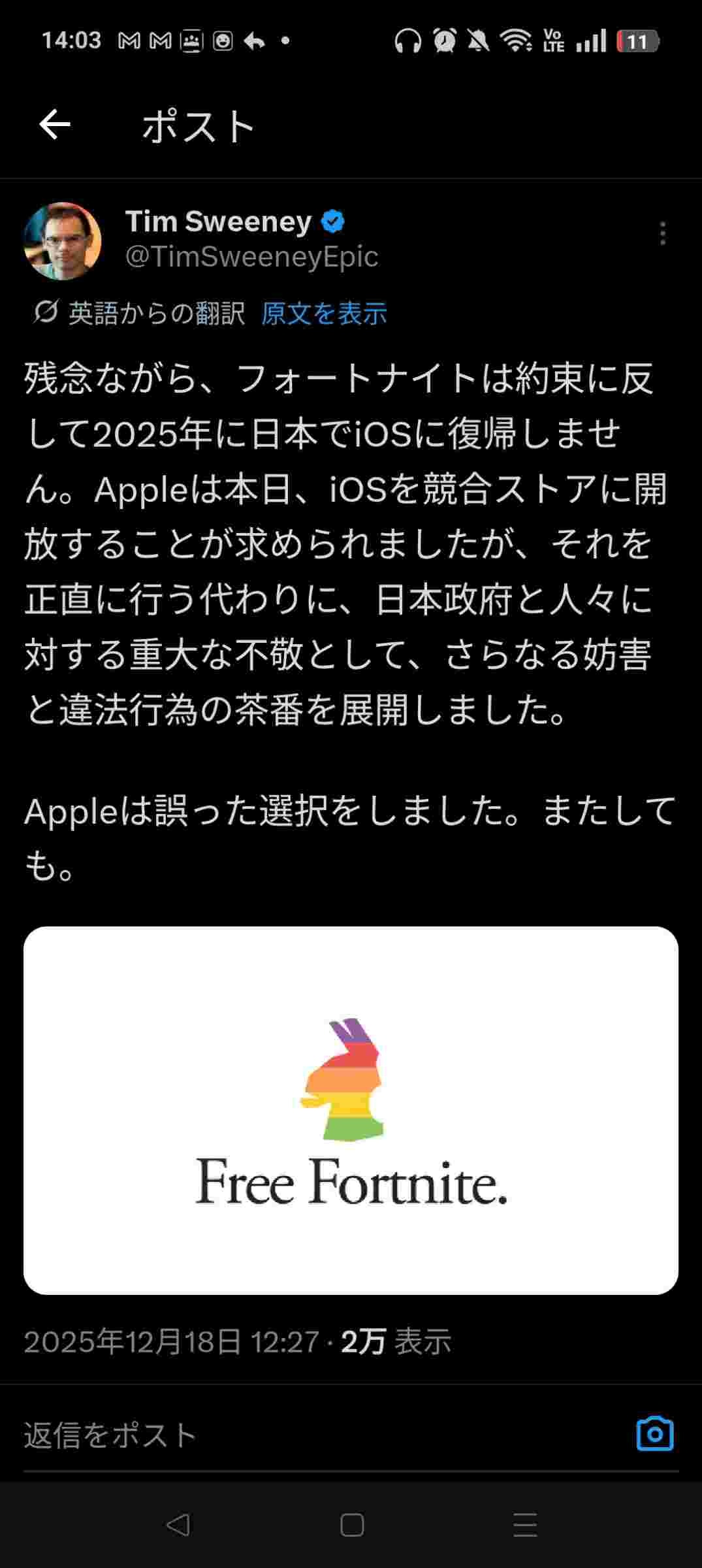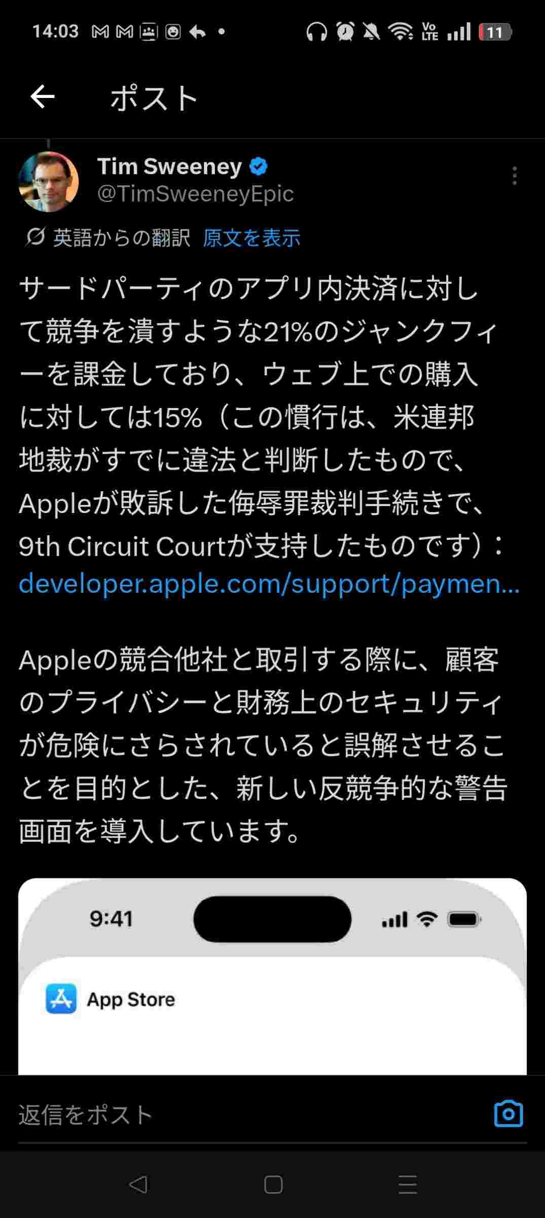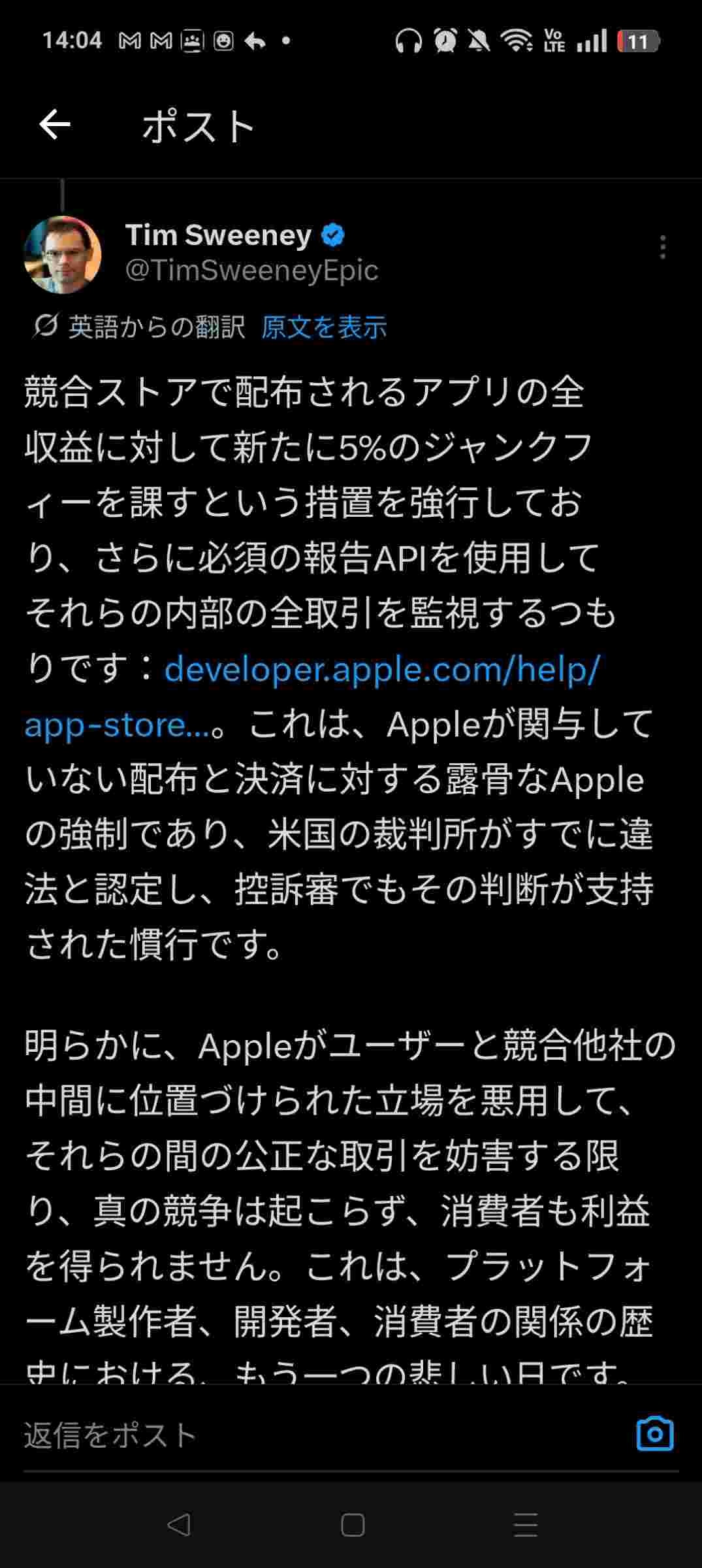 「Appleは形だけiOSを開放したふりをして、実際には高額手数料と警告表示で競争を潰している。これは違法だしエピックゲームズは日本でアップルを訴える」としてる
