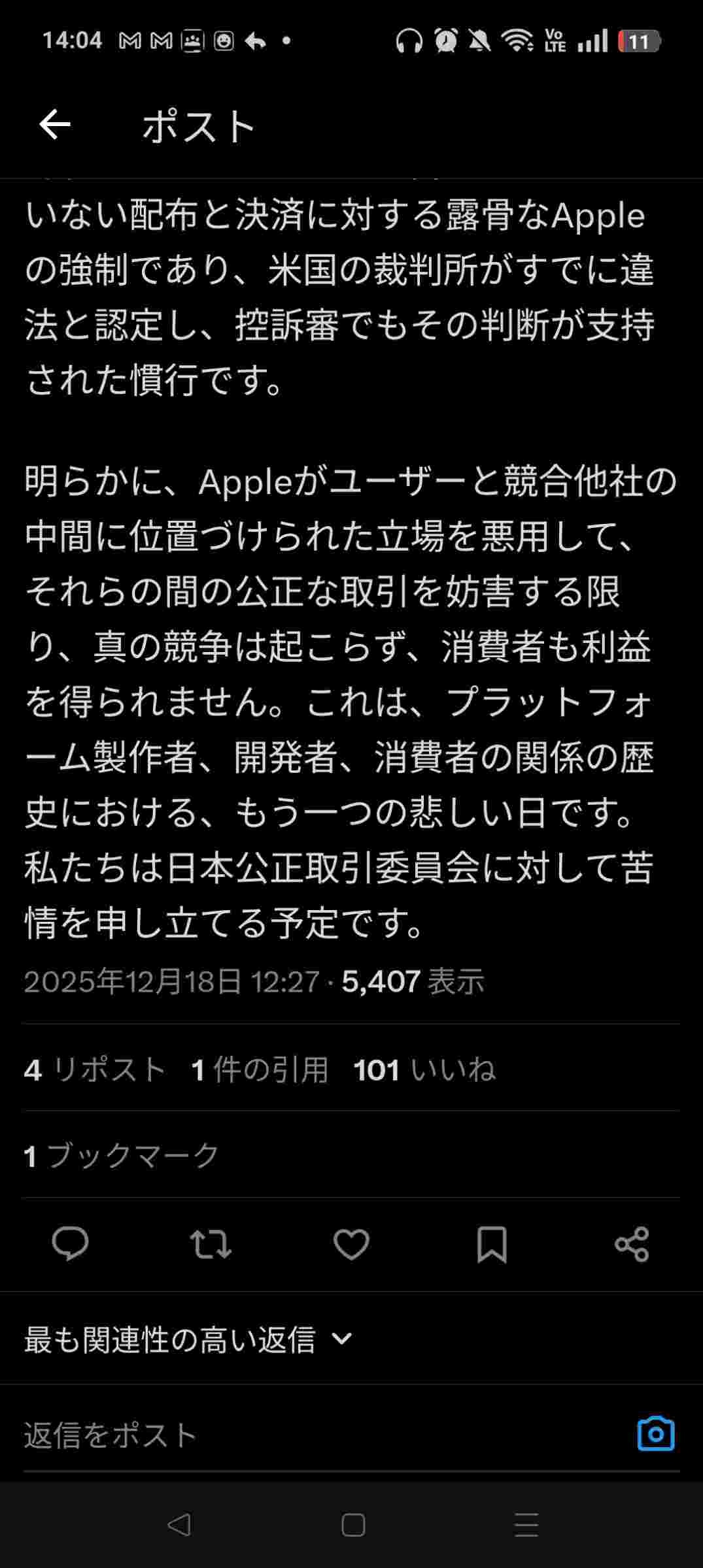 「スマホ新法が18日に施行されてAppleは自社以外のアプリストアも許可しないと違法になったのに、実際には高額手数料と警告表示で競争を潰している。これは違法で、エピックゲームズは日本でアップルを訴える」ということ