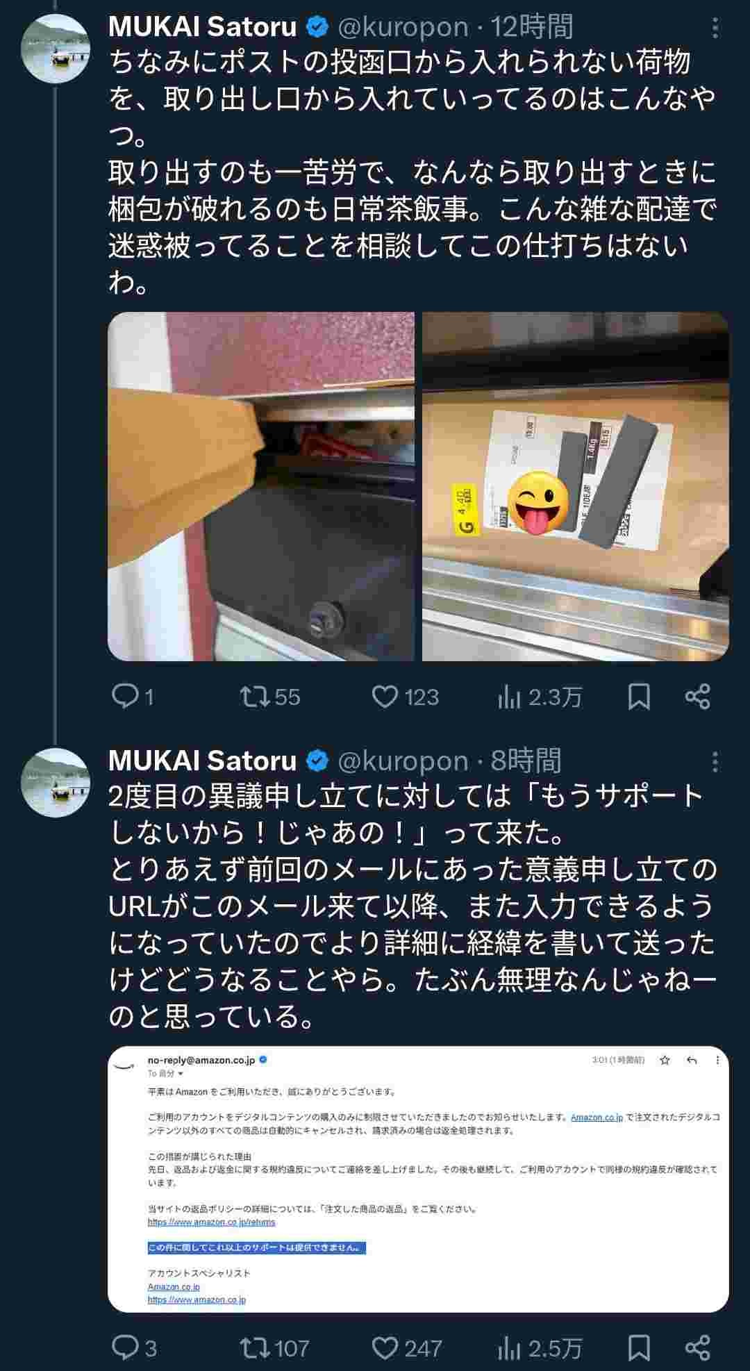 2度ほどチャットでクレーム付けたことあるけど配達員には厳しく指導を行い再発の防止に努めます、なんならペナルティ与えます、なんなら同じ商品をもう一度送りましょうか、ってこっちが恐縮するくらい懇切丁寧だったわ
