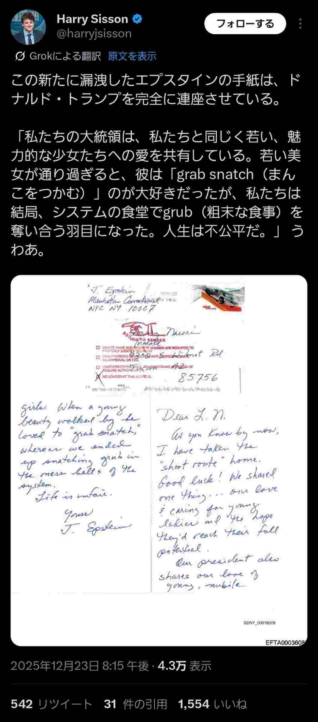 エプスタインが共犯者に宛てて書いた手紙「トランプは俺達のロリ友達だったのに俺達だけ刑務所で臭い飯を食うハメに」