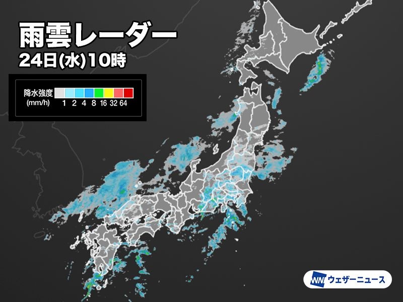 広範囲で本降りの雨 局地的に激しい雨のおそれ - ウェザーニュース今日24日(水)は前線と低気圧が通過して広い範囲で本降りの雨となっています。現在、雨が降っていない地域でも天気は下り坂で傘が必須です。weathernews.jp