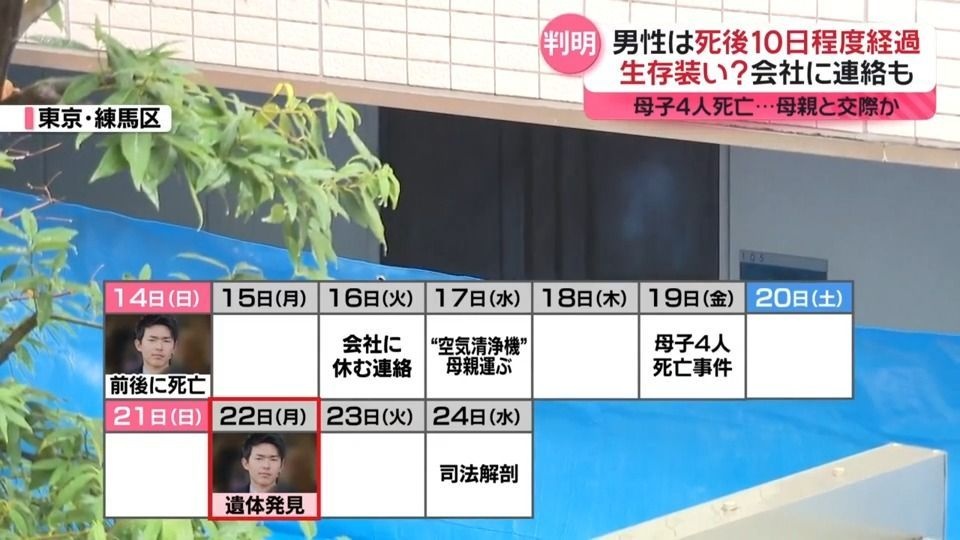 東京・西東京市で母子4人が死亡し、母親の交際相手とみられる男性が遺体で見つかった事件で、男性は死後10日程度経過していたことがわかりました。