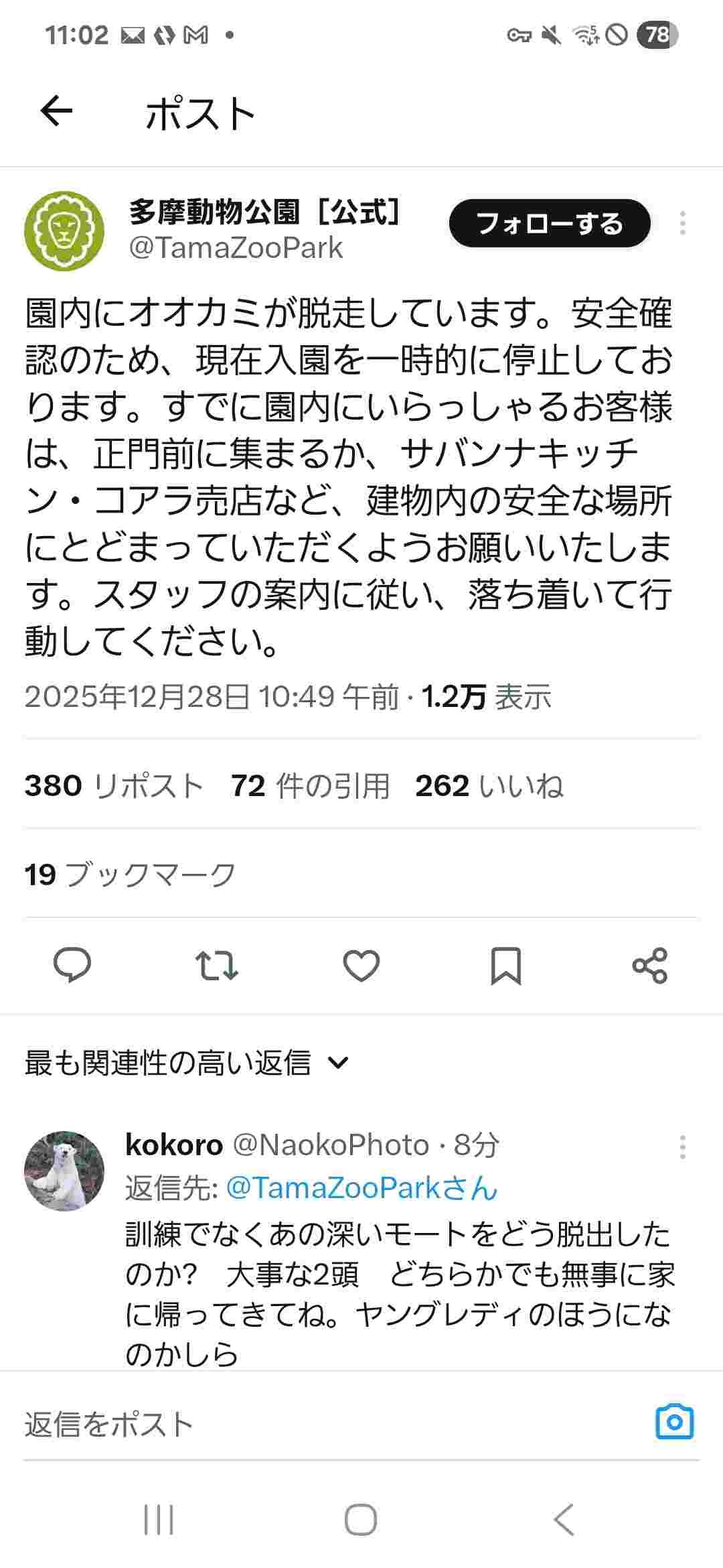 多摩動物公園でオオカミ脱走w