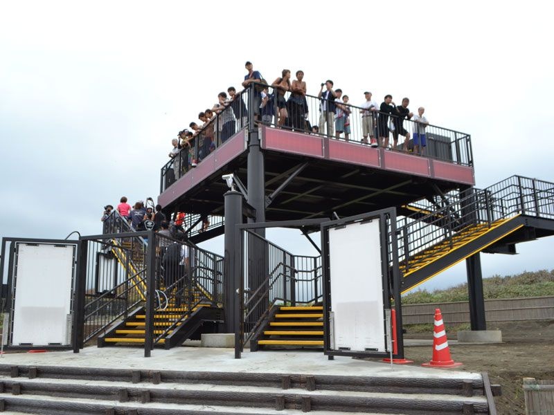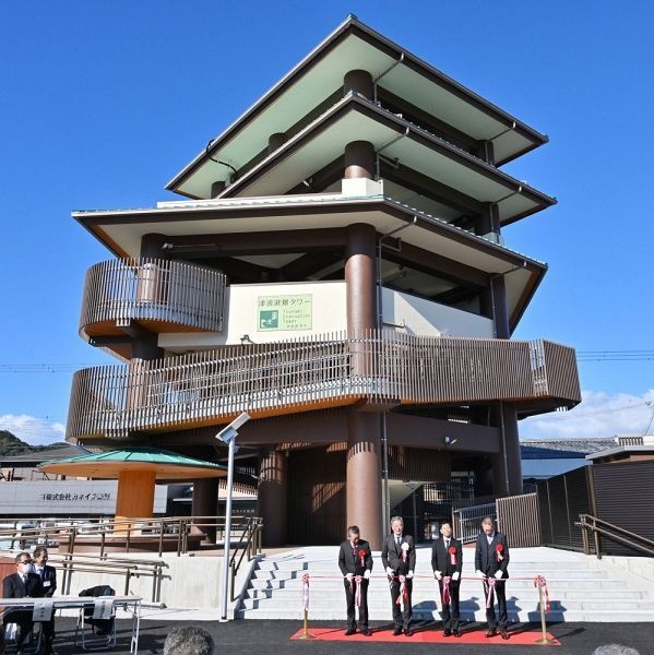 竣工式で堀順一郎町長が「町内で7本目の津波避難タワーだが、これでほぼ(3連動地震の)避難困難地域がなくなった。ここは町の一つの観光拠点であり、観光タワーとしても活用いただけるのではないか」とあいさつ。関係者でテープカットをした。