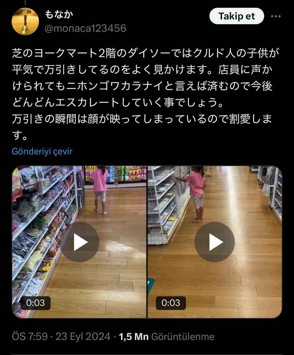 〈○○のダイソーではクルド人の子供が平気で万引きしてるのをよく見かけます。店員に声かけられてもニホンゴワカラナイと言えば済むので今後どんどんエスカレートしていく事でしょう。万引きの瞬間は顔が映ってしまっているので割愛します。〉