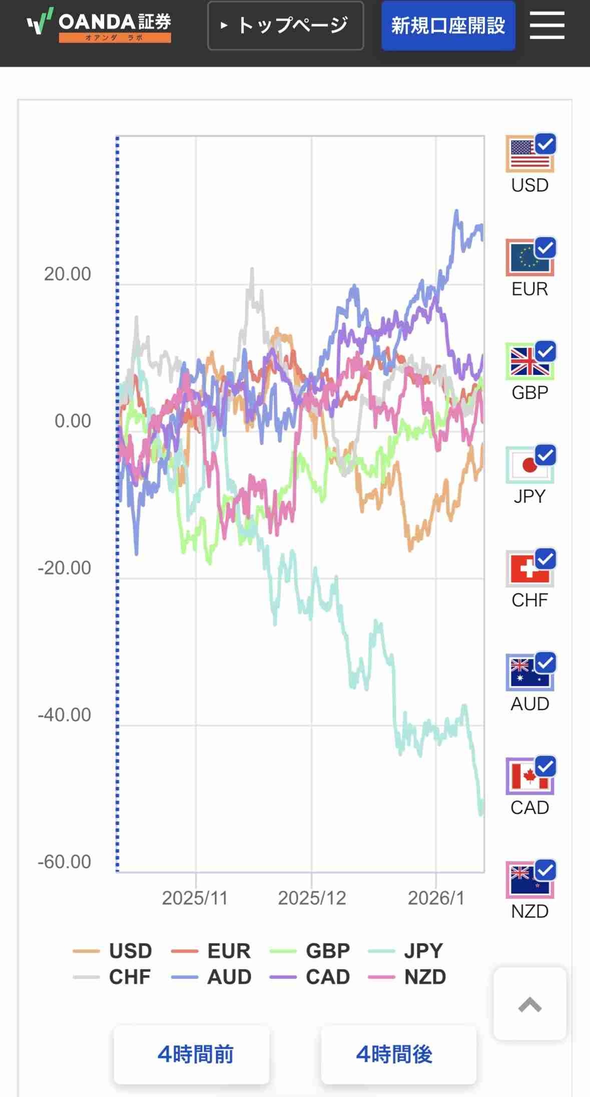 このチャートの状況であれば、最も強い「豪ドル(AUD)」を買い、最も弱い「円(JPY)」を売る「豪ドル円(AUD/JPY)」の買い(ロング)が、最もトレンドに乗りやすい取引候補となります。