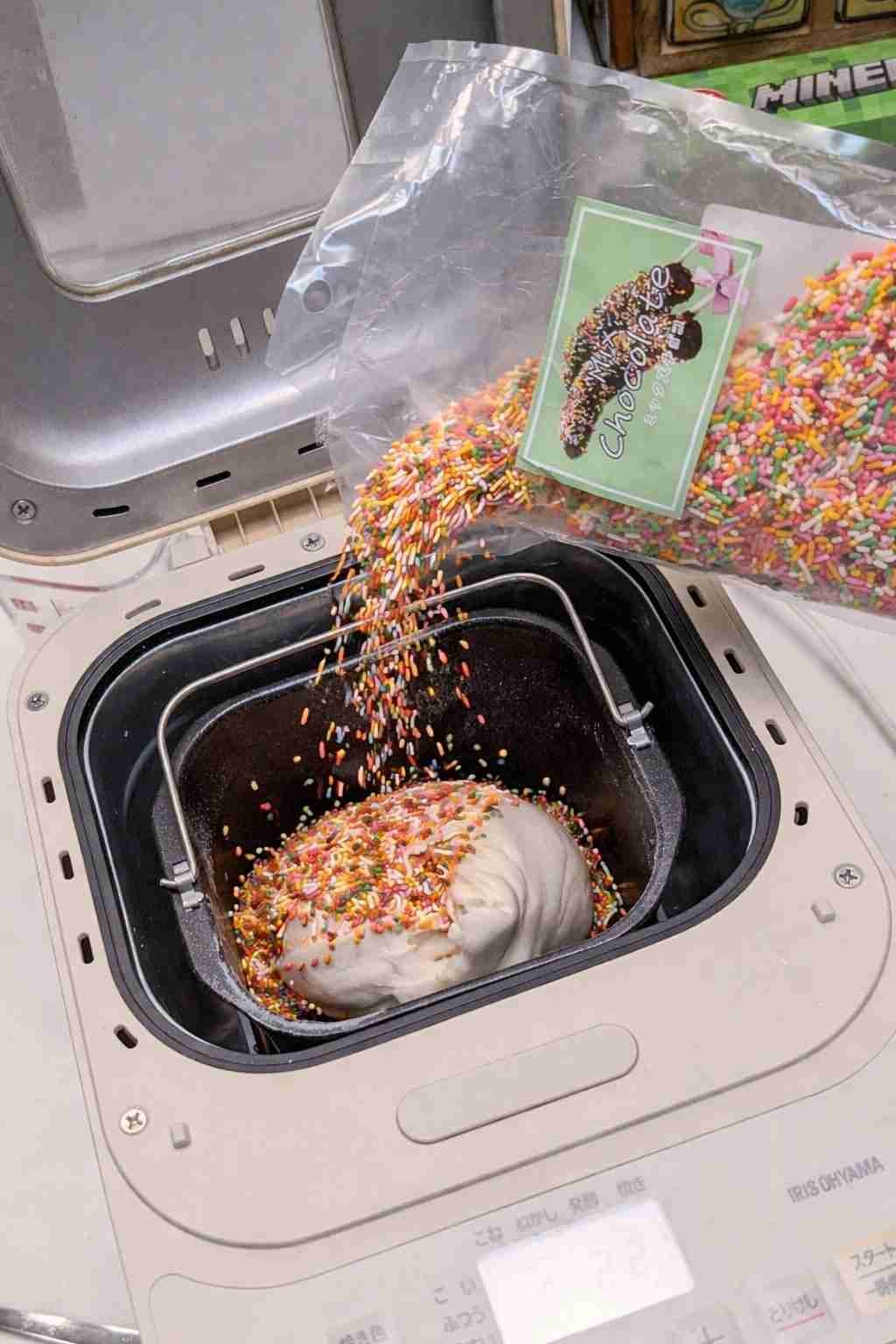 そこに写っていたのは、ホームベーカリーのパン生地に、お菓子のトッピングなどで使われるカラースプレーをたくさん入れている様子でした。