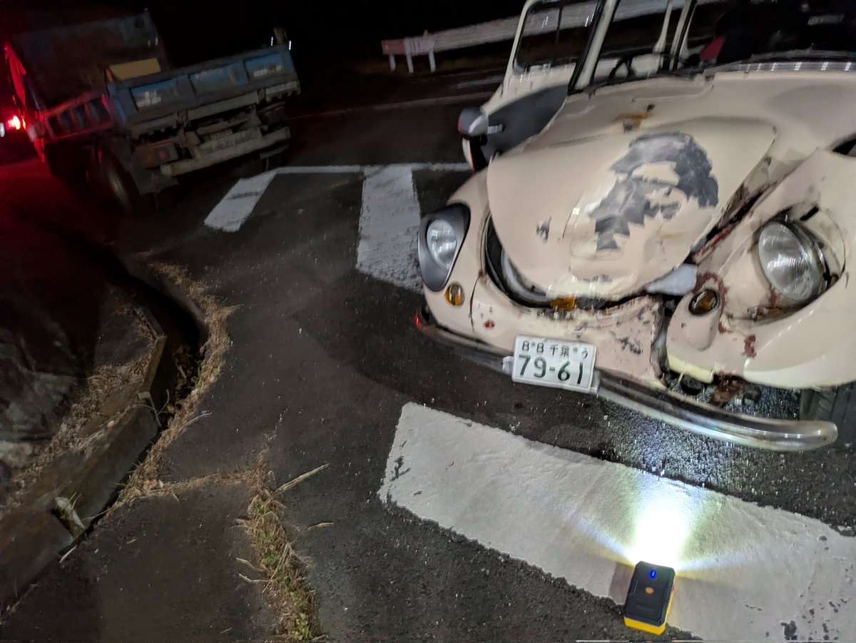 普通トラックと左フロントに衝突、頭打ったが無傷。