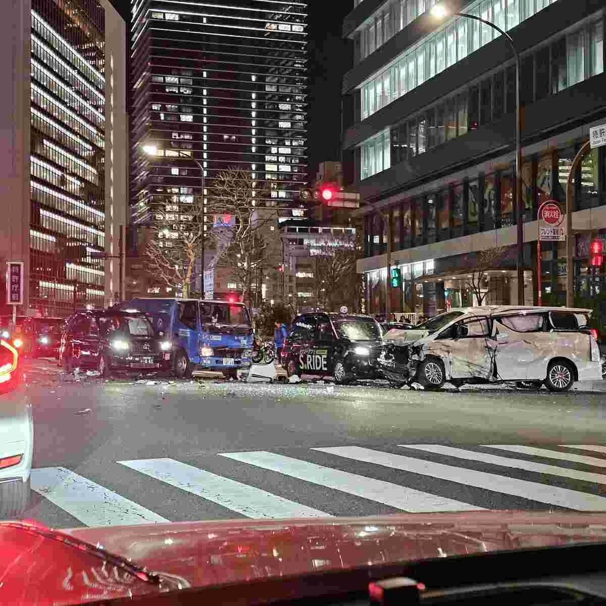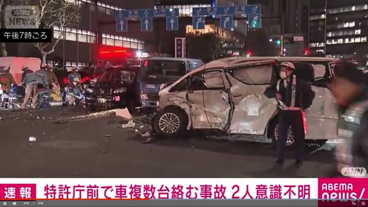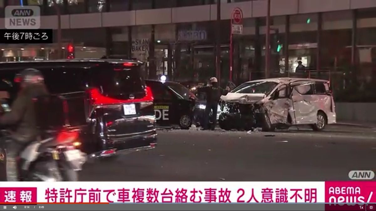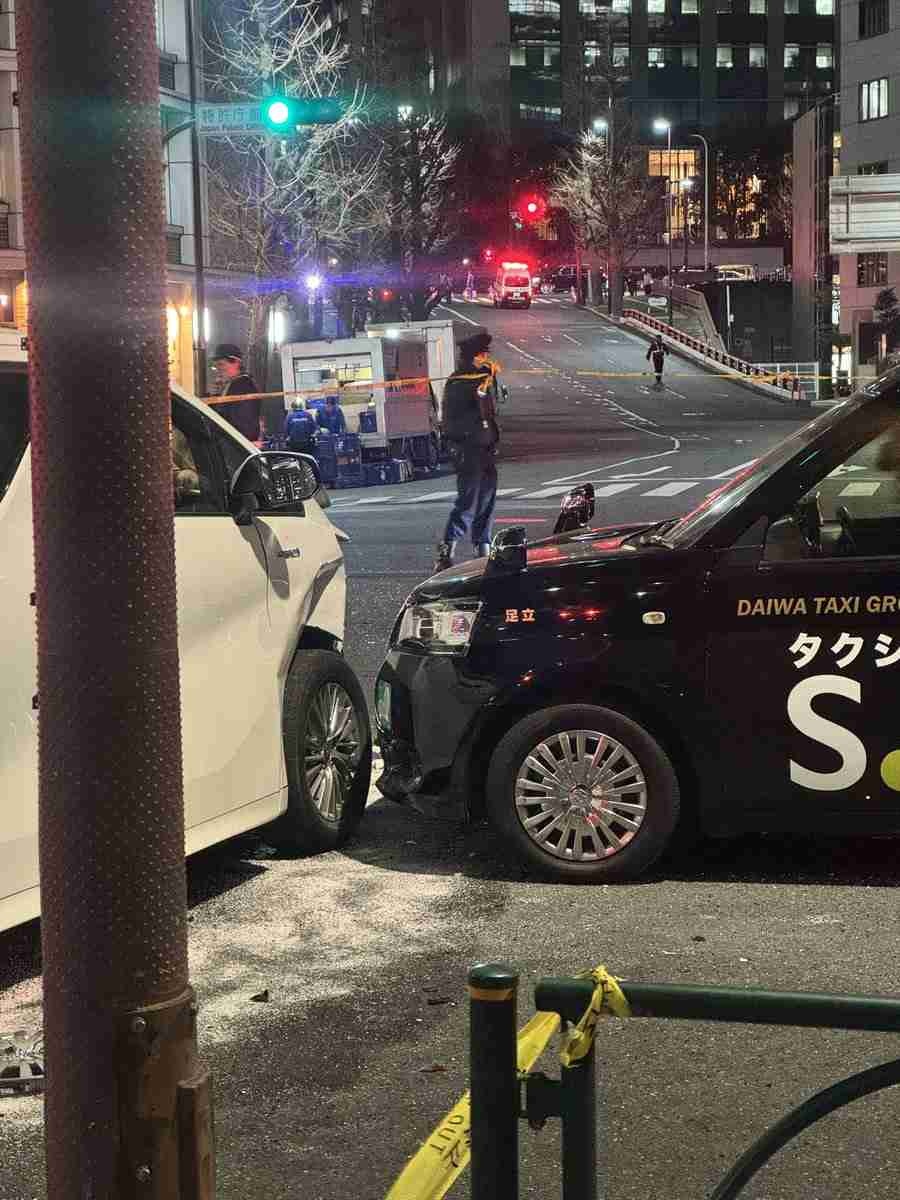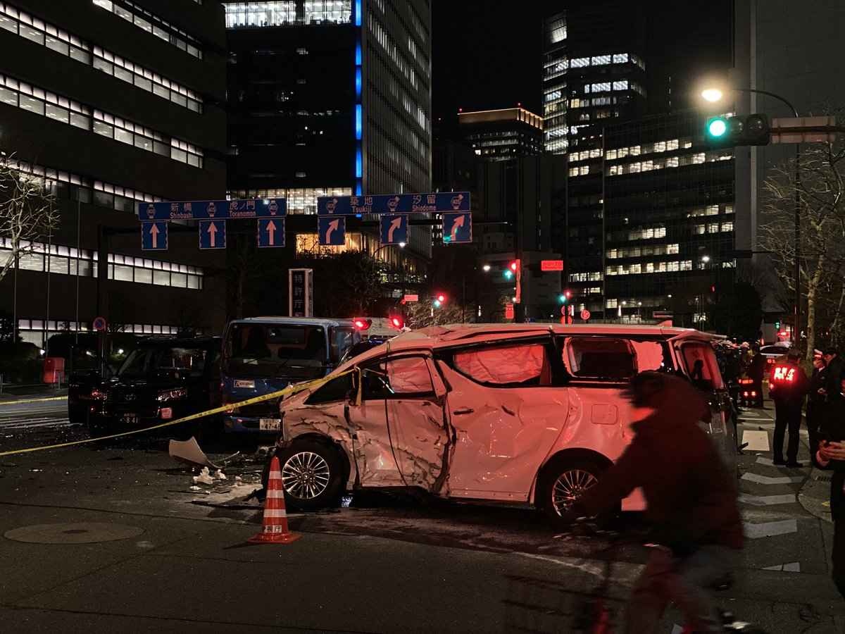 捜査関係者によりますと、きょう午後6時半すぎ、東京・港区赤坂1丁目の「特許庁前」の交差点で、タクシーやごみ収集車など車両6台が絡む事故があったということです。【写真を見る】車両6台が絡んだ事故現場の様子