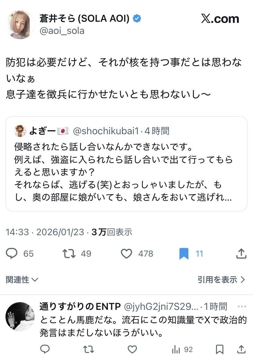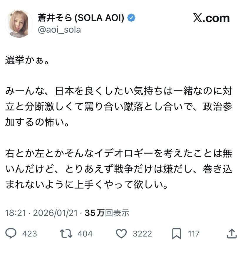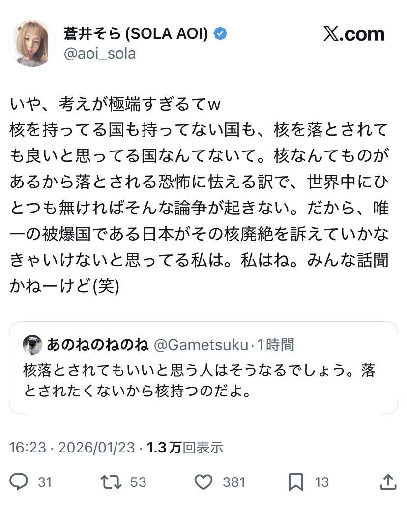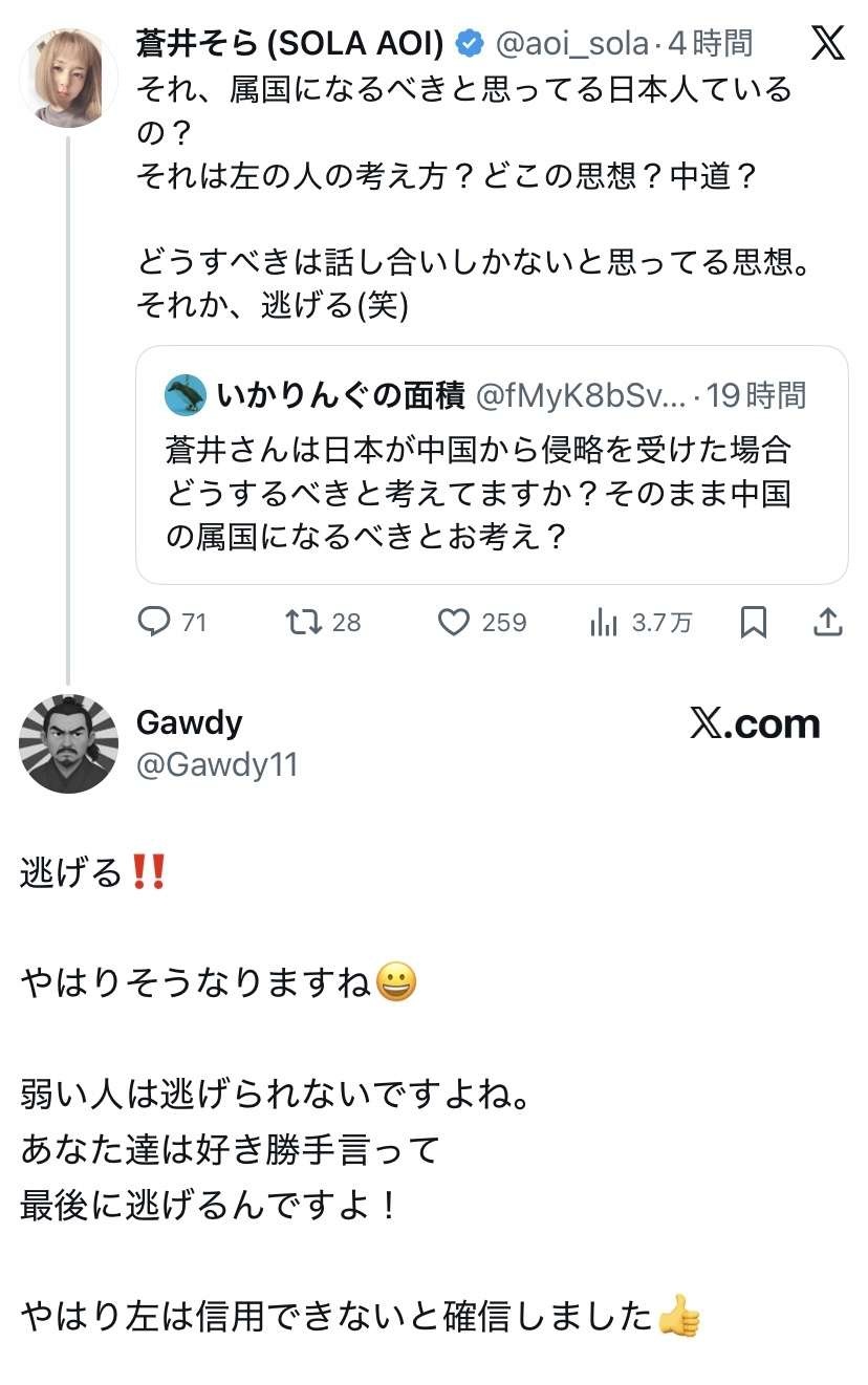 蒼井そら(44)、日本の愛国者たちにダル絡みされて炎上