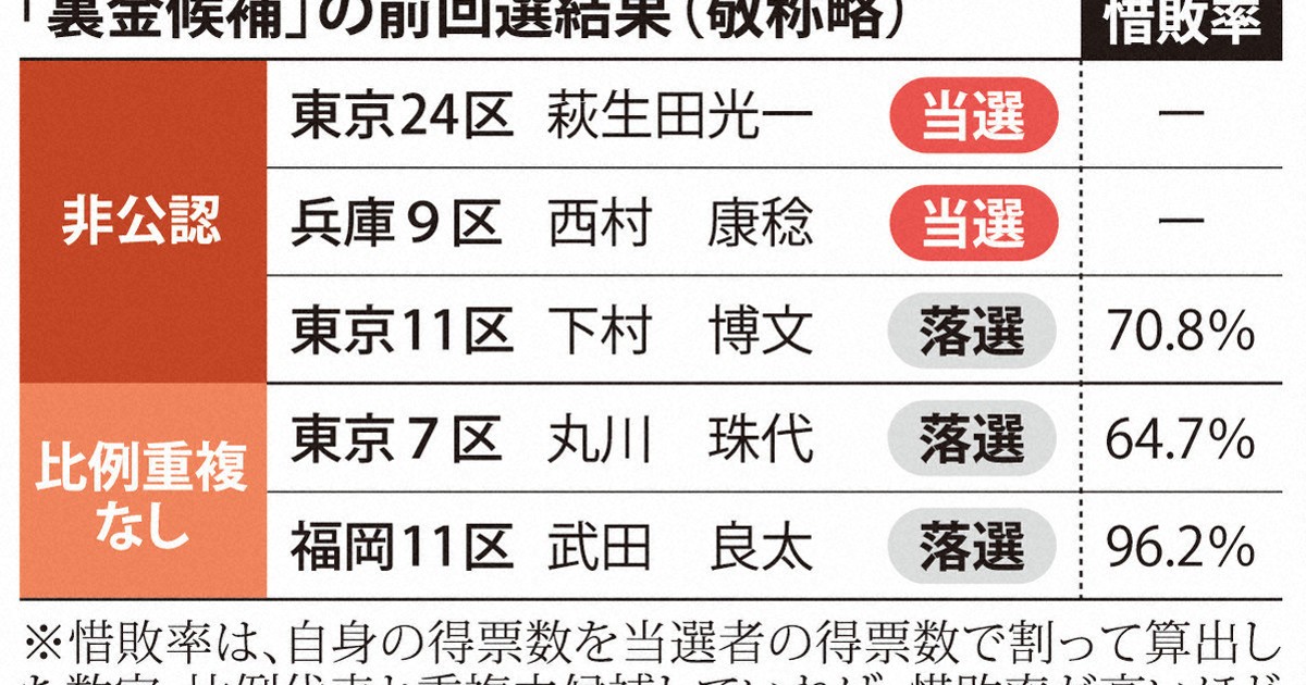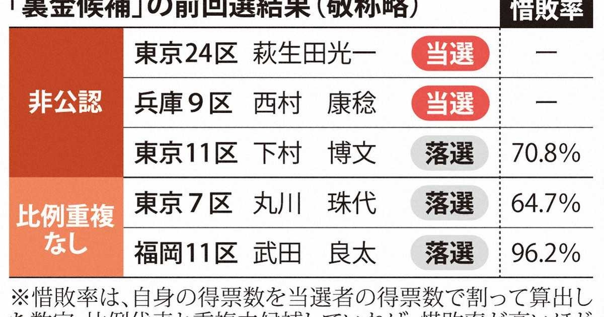 前回は比例重複を認めずに落選者が多数に上ったが、今回は復活当選も可能になる。 自民公認の裏金候補は43人 比例重複が認められ復活当選も可能に | 毎日新聞27日公示の衆院選で、自民党は、派閥の政治資金パーティー裏金事件に関係した前議員らのうち43人を公認した。前回衆院選で党内処分が継続していることなどを理由に非公認や比例単独名簿への登録を見送った12人も含まれる。この12人に限らず、小選挙区...mainichi.jp