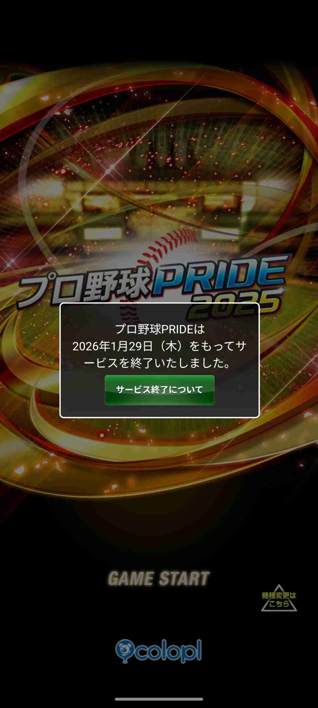 コロプラのアプリ『プロ野球PRIDE』のサービスが、2026年1月29日15時をもって終了となります。