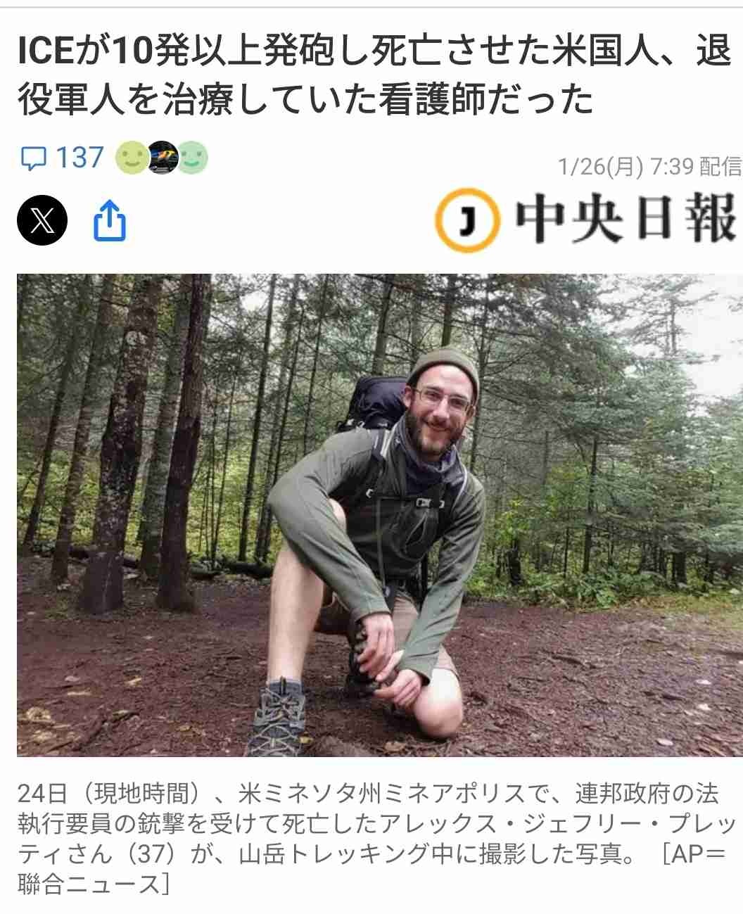 事件は、トランプ政権が不法移民の摘発作戦を進める中で起きた。トランプ氏はホワイトハウスで記者団に「私が調査を監督する」と述べた。27日に出演した米FOXニュースの番組では、銃を携帯していたプレッティさんを非難しつつ、「彼ら(連邦捜査官)がどうやって(プレッティさんの)銃を見たかは知らない」と言葉を濁した。