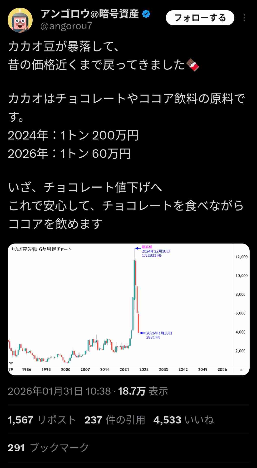 でもカカオの値段が下がっても市場に出回る製品の値段は一度上がったら下がることは基本的にないからな