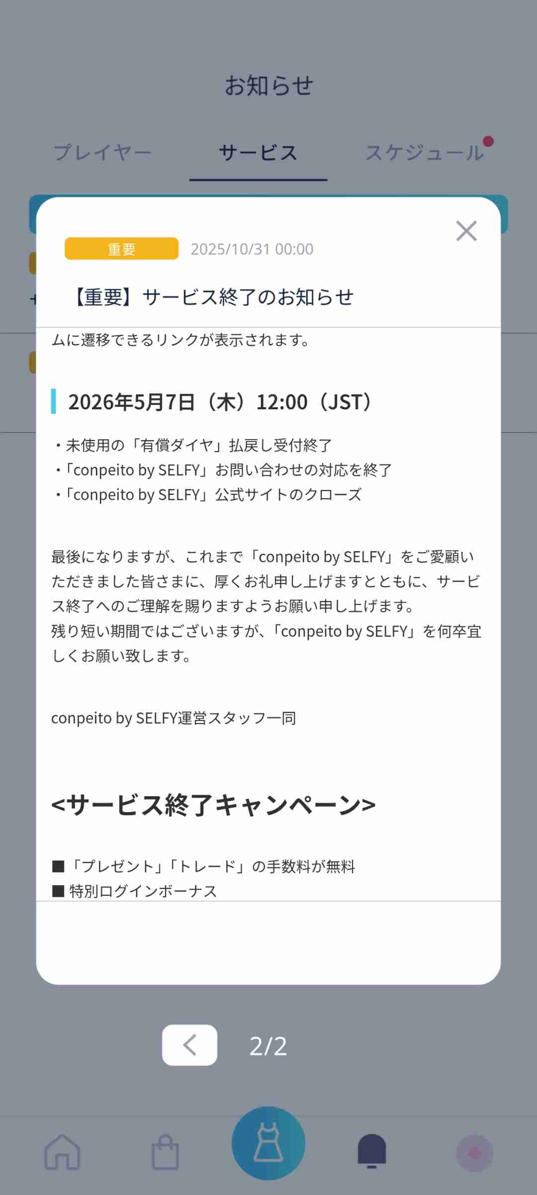 この度「conpeito by SELFY」は2026年2月2日(月)12:00(JST)をもちまして、サービスを終了することとなりました。