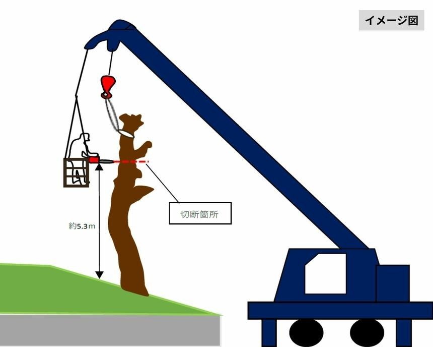 人を吊って高所に運んで、人は木の上に移動して、切り落とす枝にクレーン付け替えて切断してた