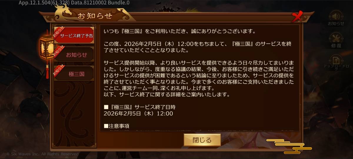 6wavesは、本日(1月6日)、『極三国 -KIWAMI-』のサービスを2026年2月5日12時をもって終了することを発表した。