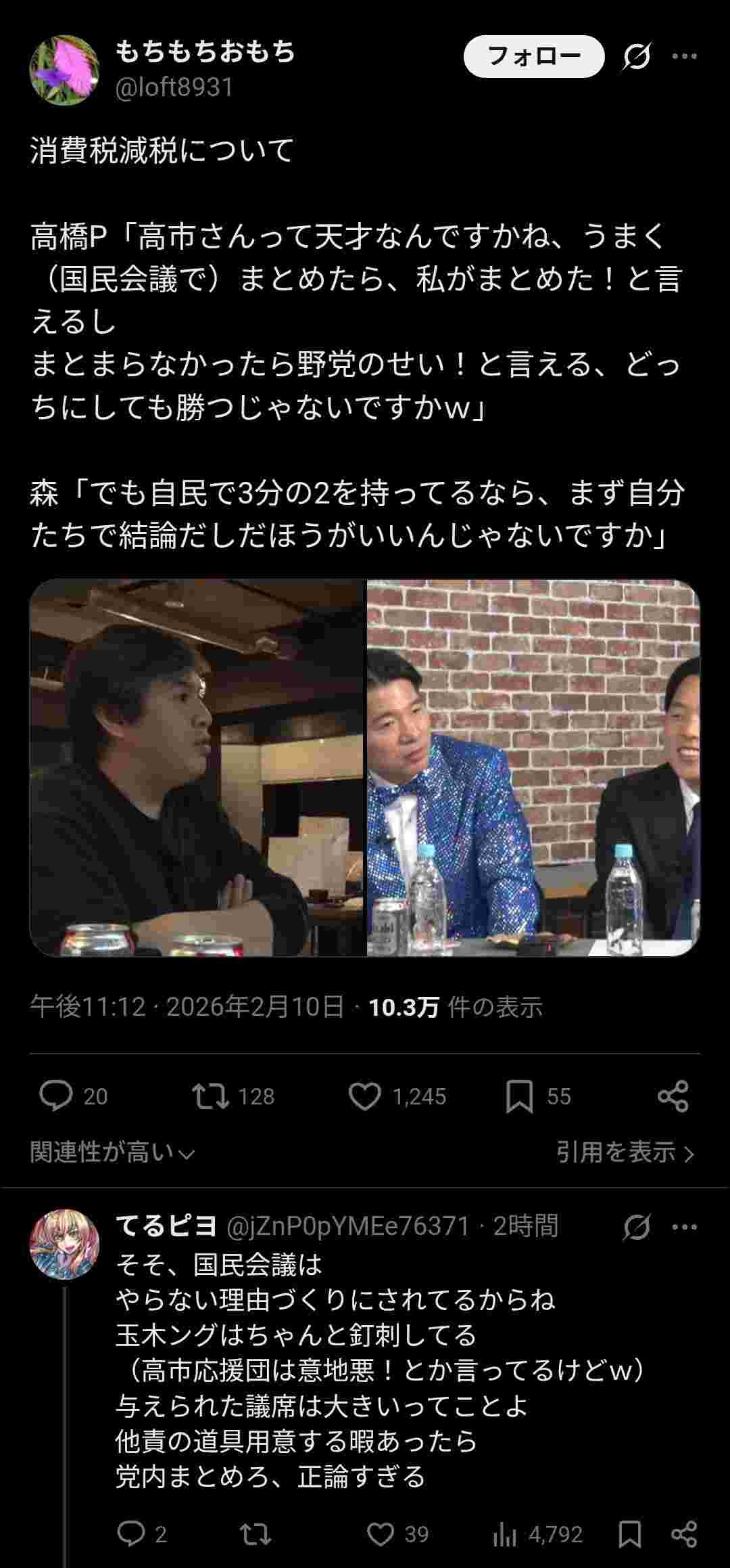 ただ、高市さんは3分の2の議席を持っているので、野党が反対しているから消費減税がだめになったと言うのはどうなのか」。