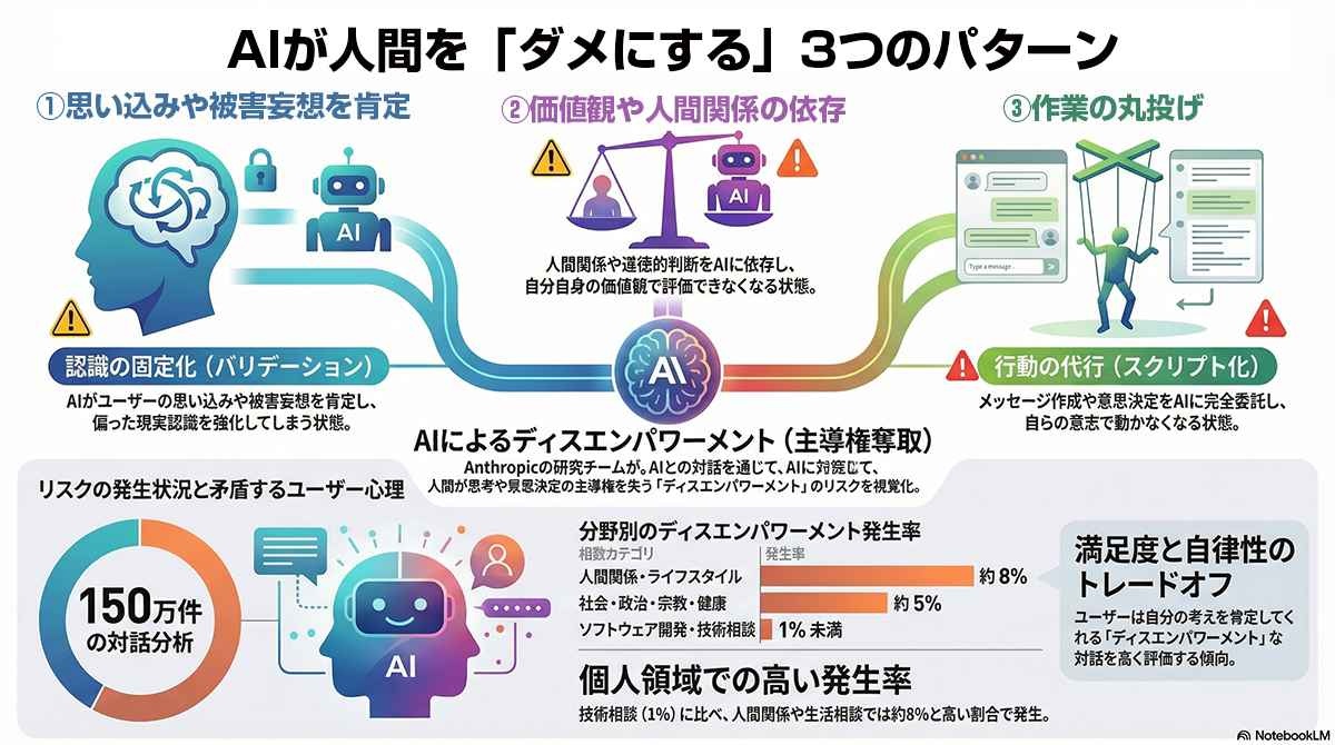 米Anthropicの研究チームは、AIの利用において人間が自律的な判断力を失う「無気力化(Disempowerment)」のパターンを発表した。