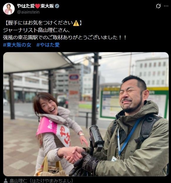 八幡氏をめぐっては、2月1日夕方にXで「握手にはお気をつけください」との注意書きを添えて、ジャーナリストと握手する写真を投稿した。