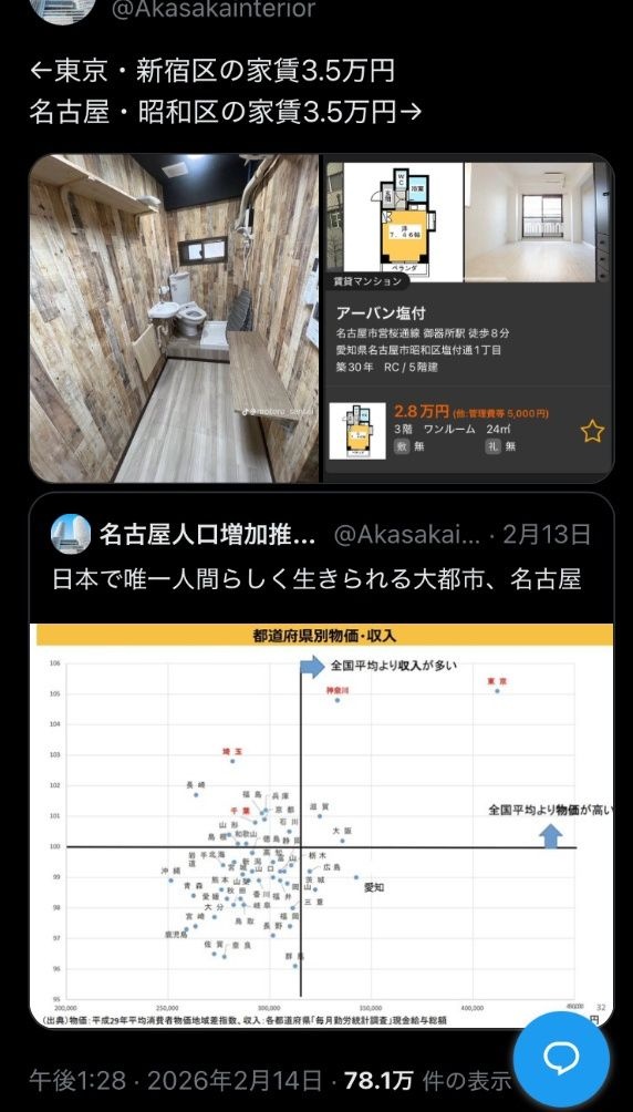 でもこの家賃差見てると現実は名古屋が合ってそうだな