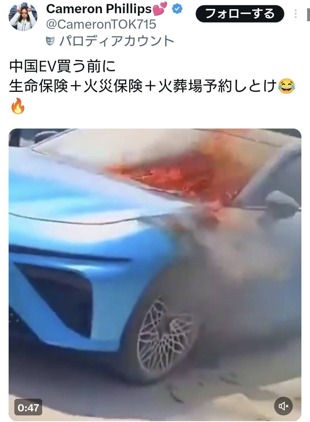シナ製EV車が火葬付き走る棺桶なんて最初から言われてた事だろ