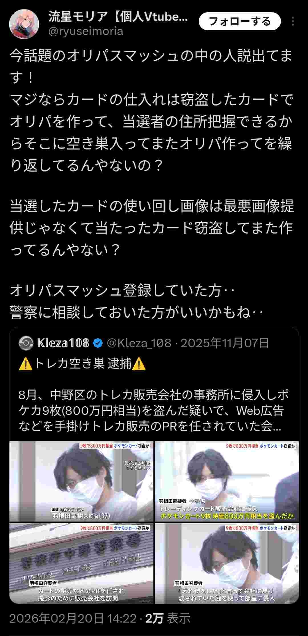 オンラインオリパ屋さん「カードショップと提携して店からカード盗めば仕入れ無料じゃね?」→窃盗で逮捕www