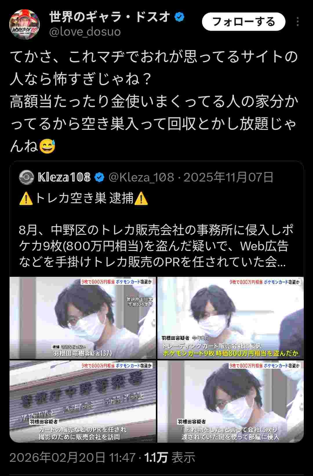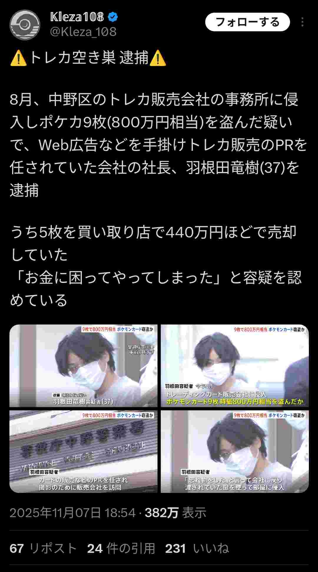 コレクターが謎の窃盗されてる事件多発してたけど絶対これやろ