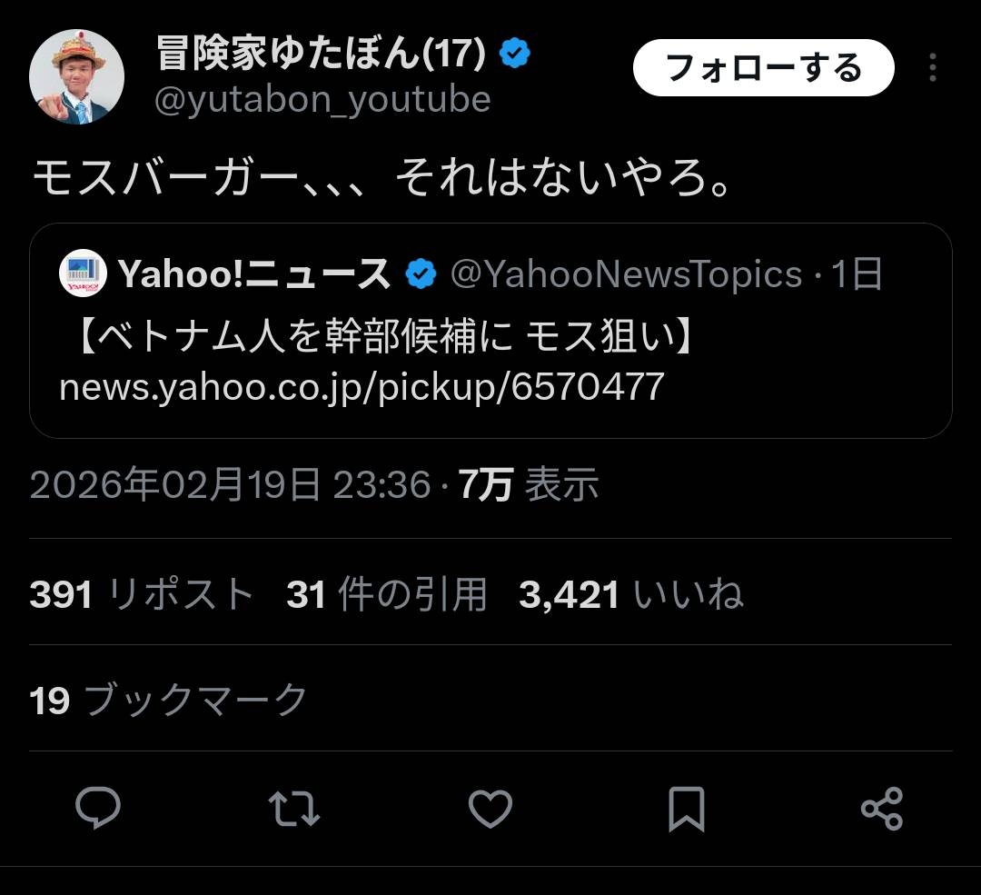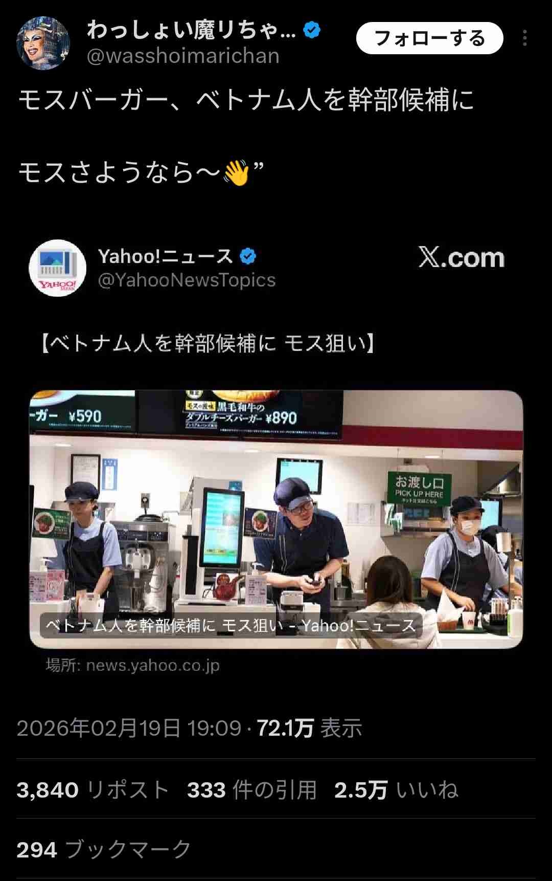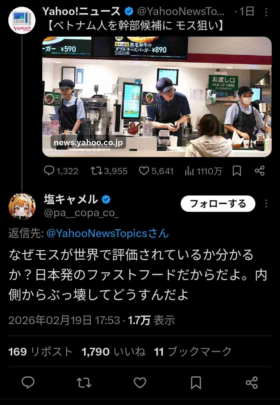 モスフードサービスがベトナム人を店長候補として本格育成するニュースが2026年2月19日のYahoo!ニュース配信で再燃し、X上で不買宣言が殺到した。