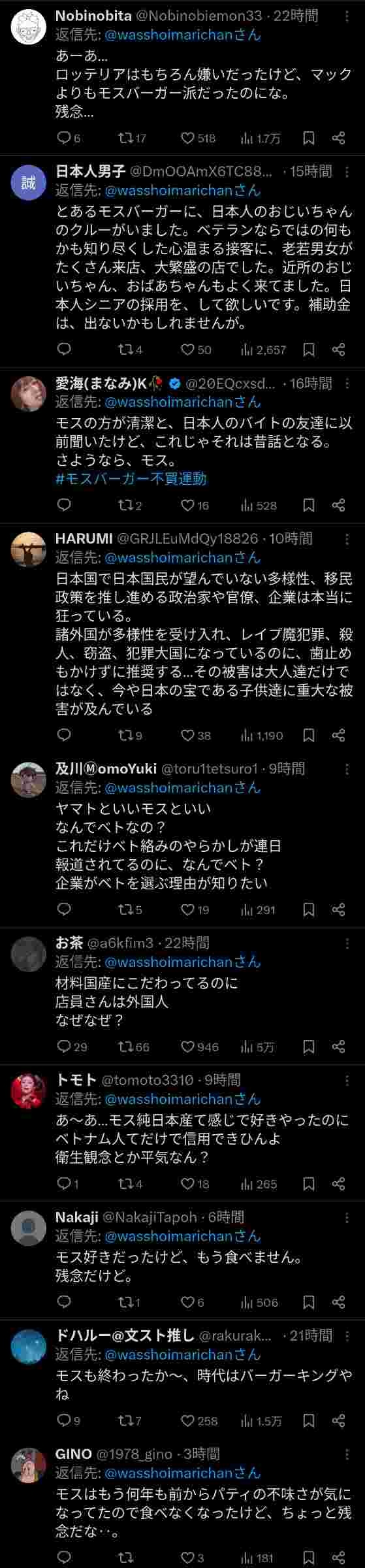 不買宣言のほか、「中国産食材との関連も絡めてさようならモス」「移民推進すぎる」との声が連鎖し、一部YouTube動画も「大炎上」と煽る形で話題を広げた。へずまりゅう氏らの影響で不買運動が加速した事例も見られる。