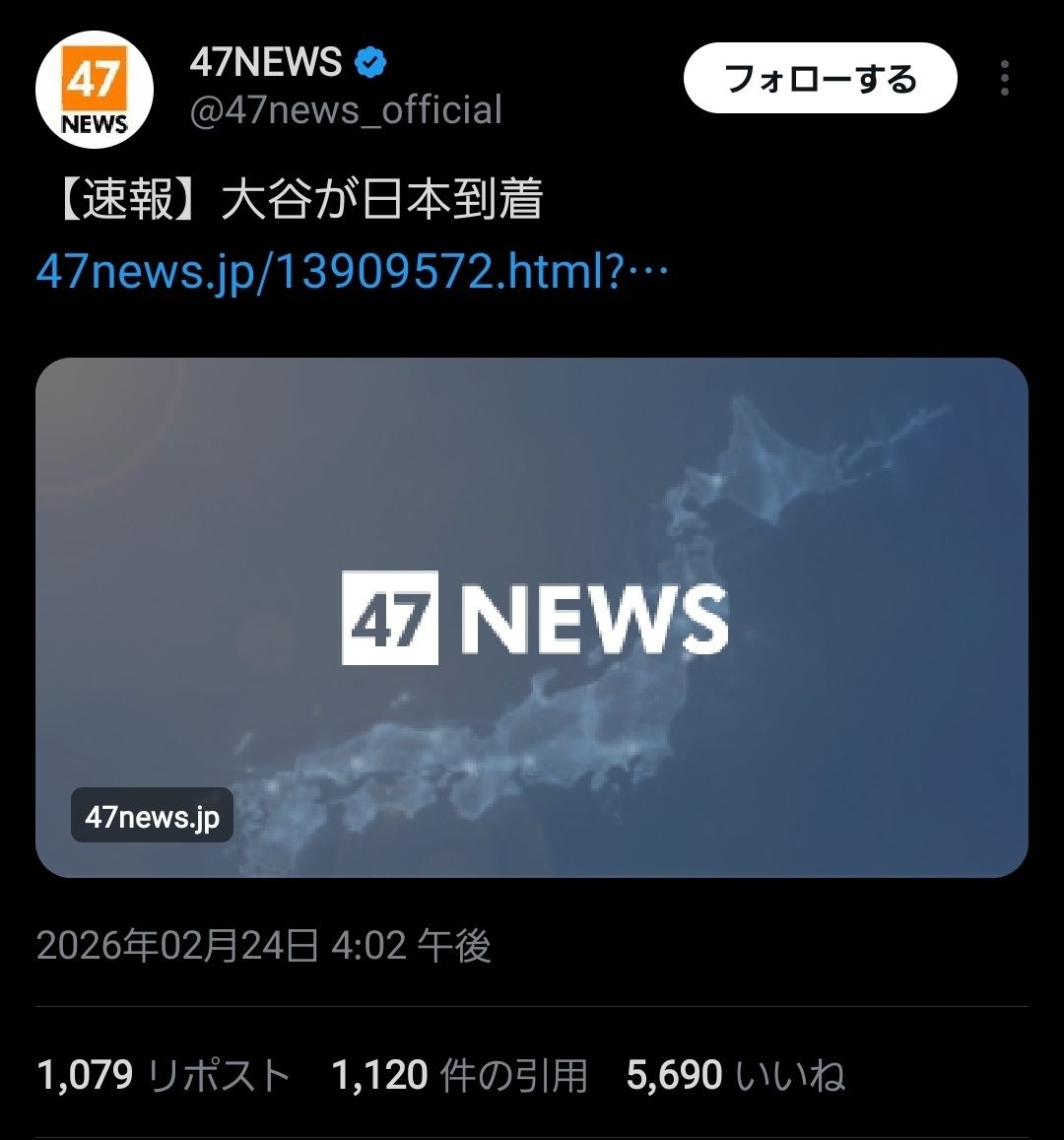 【速報】大谷が日本到着 #47NEWS https://www.47news.jp/13909572.html