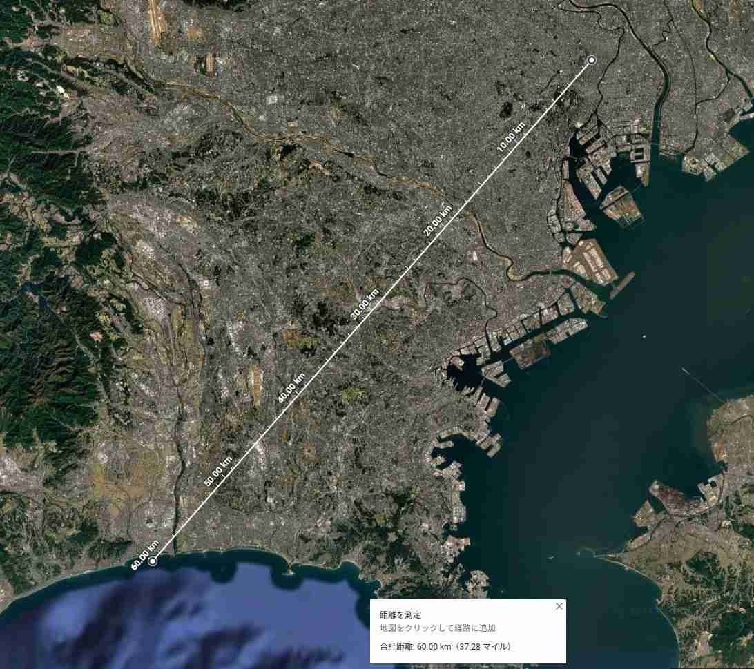 たとえば東海道線沿線なら都心から60km離れた平塚まで住宅密集地で1つの大都市