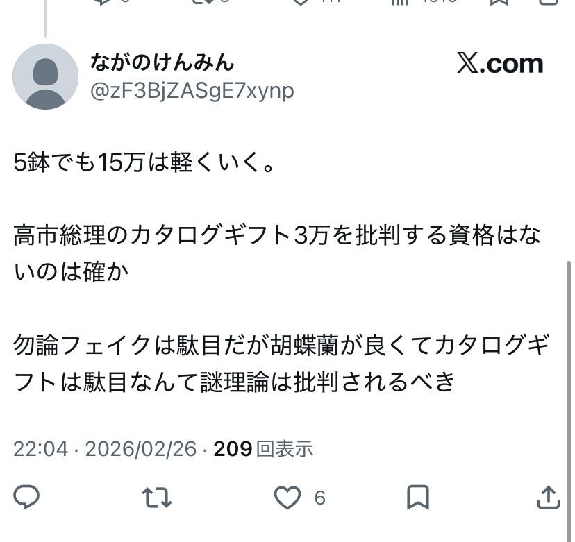 高市のカタログギフトが5000円分でも叩いてんだろ