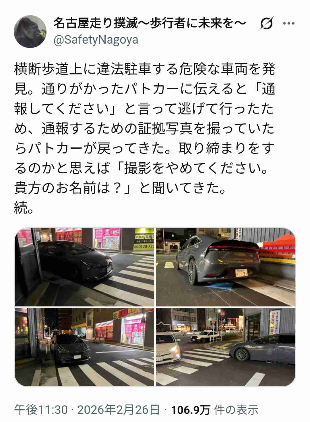 市民「横断歩道に違法駐車カスが」愛知県警「危険じゃないので取締しません。撮るのやめてください」