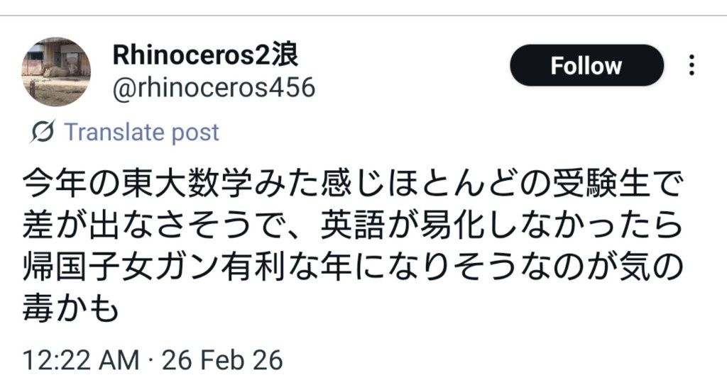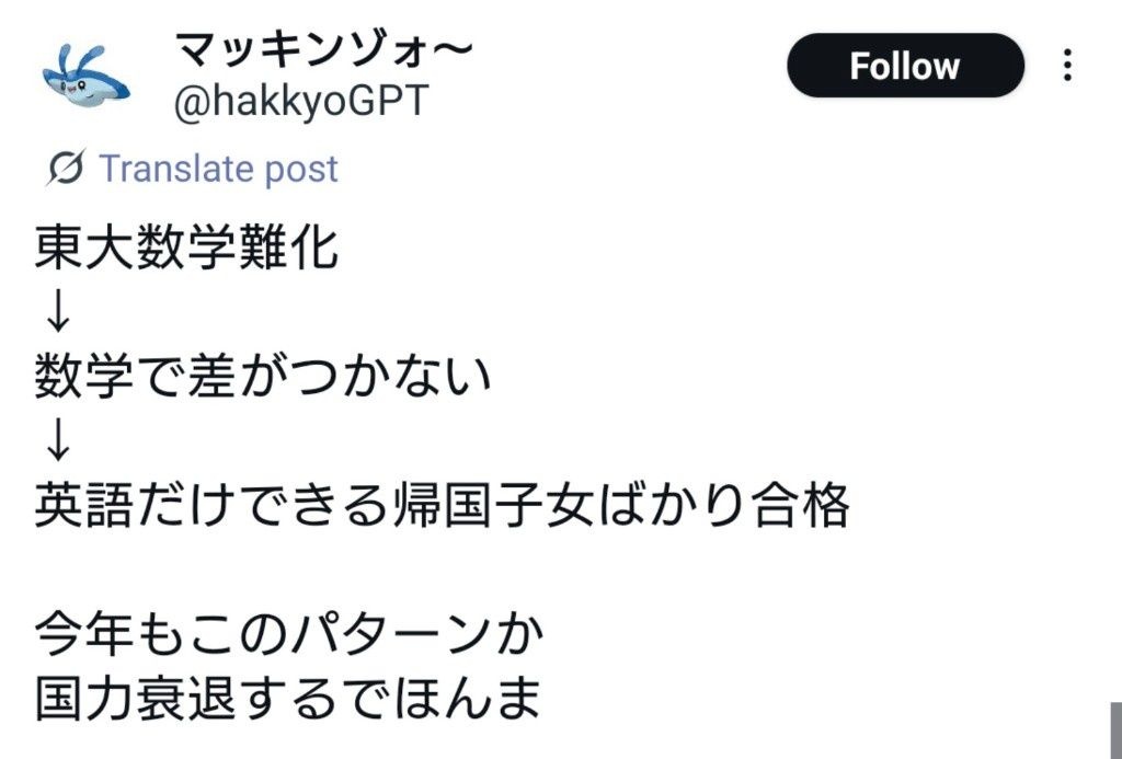 東大「純ジャパの数学コツコツ勢はいりません。帰国子女の英強が欲しいです。」←これ見え見えで好き