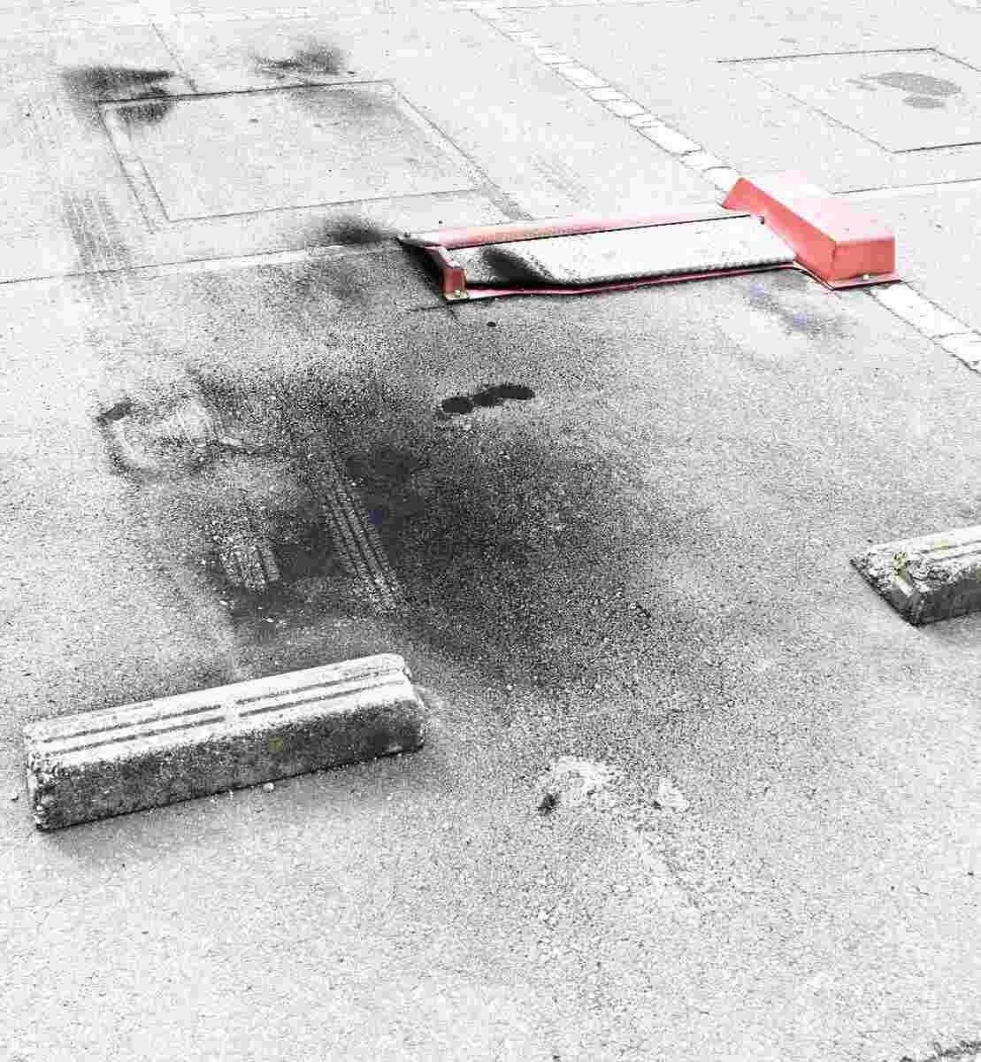跳ね上がるコインパーキングの板の後ろに煤が付きまくってるから、
