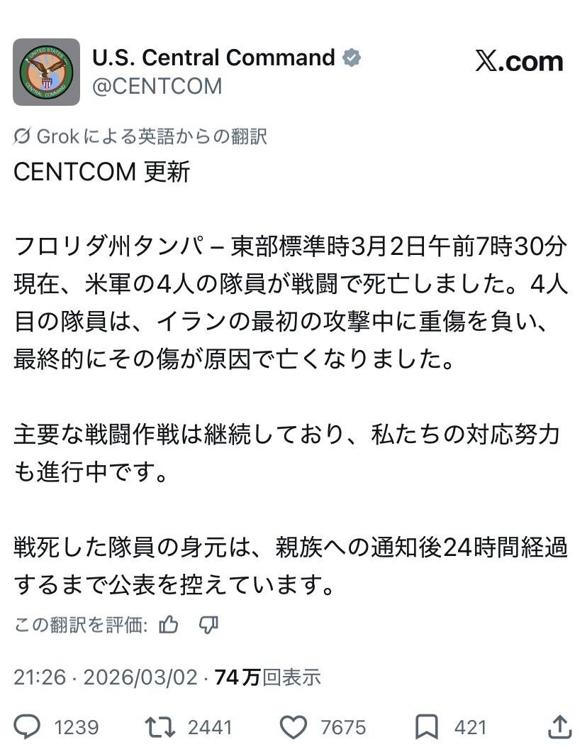 リアルタイムの米軍発表でもまだ4人しか死んでないのか