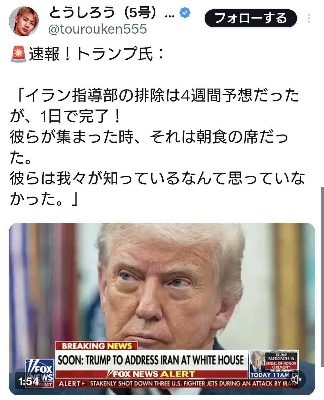 トランプ氏「イラン指導部、始末すんの4週間予想だったが1日で終わったわw奴ら全然気づいてねぇ」
