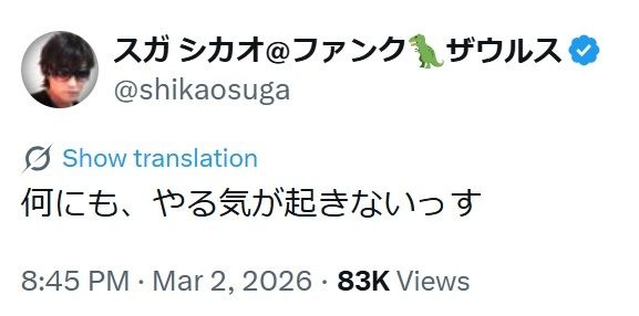 スガは特に原因などには触れず「何にも、やる気が起きないっす」とだけつづった。