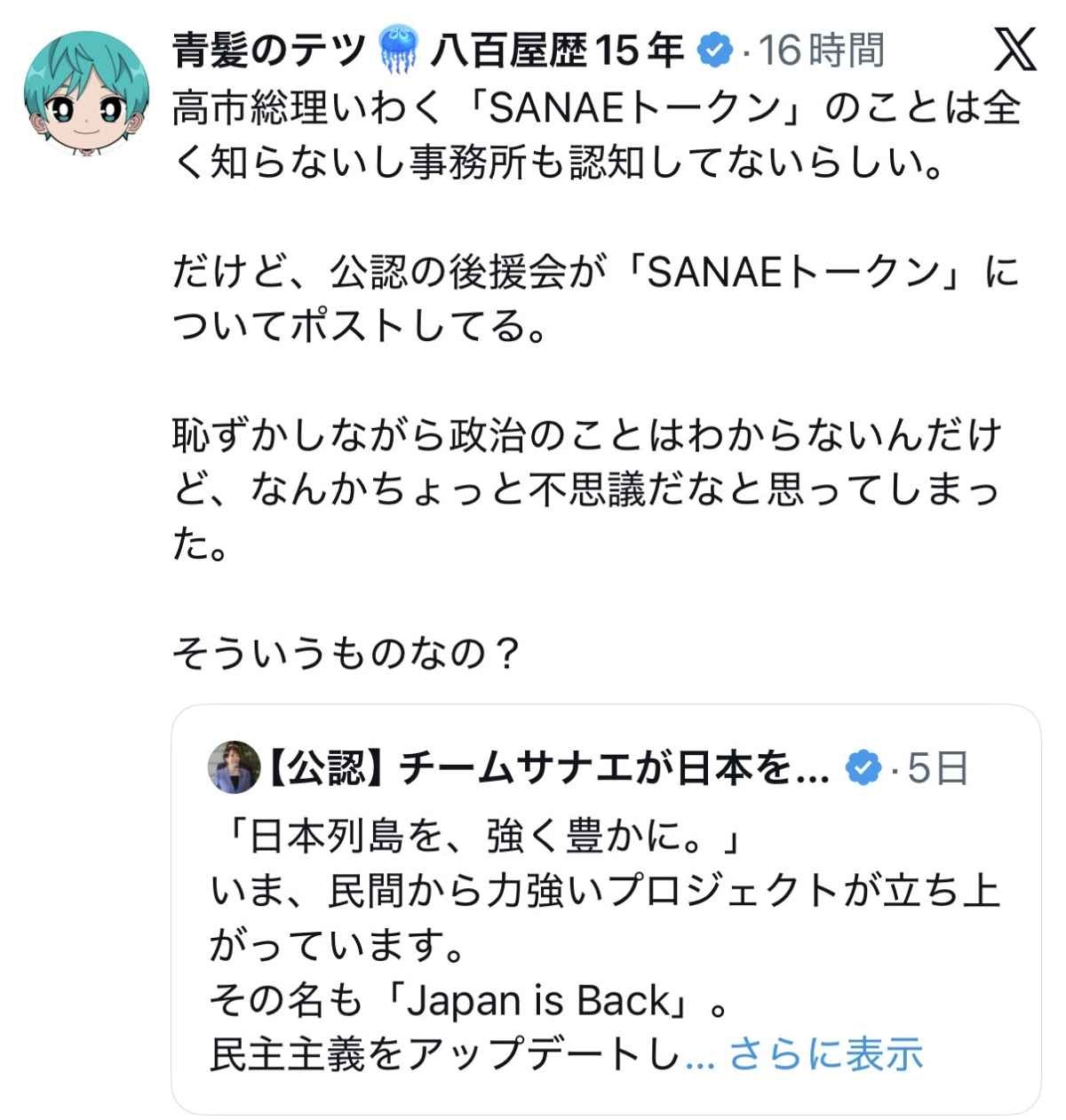高市が存在を認知している高市応援アカウントがSANAE TOKENの発行を引用リツイートしただけやで