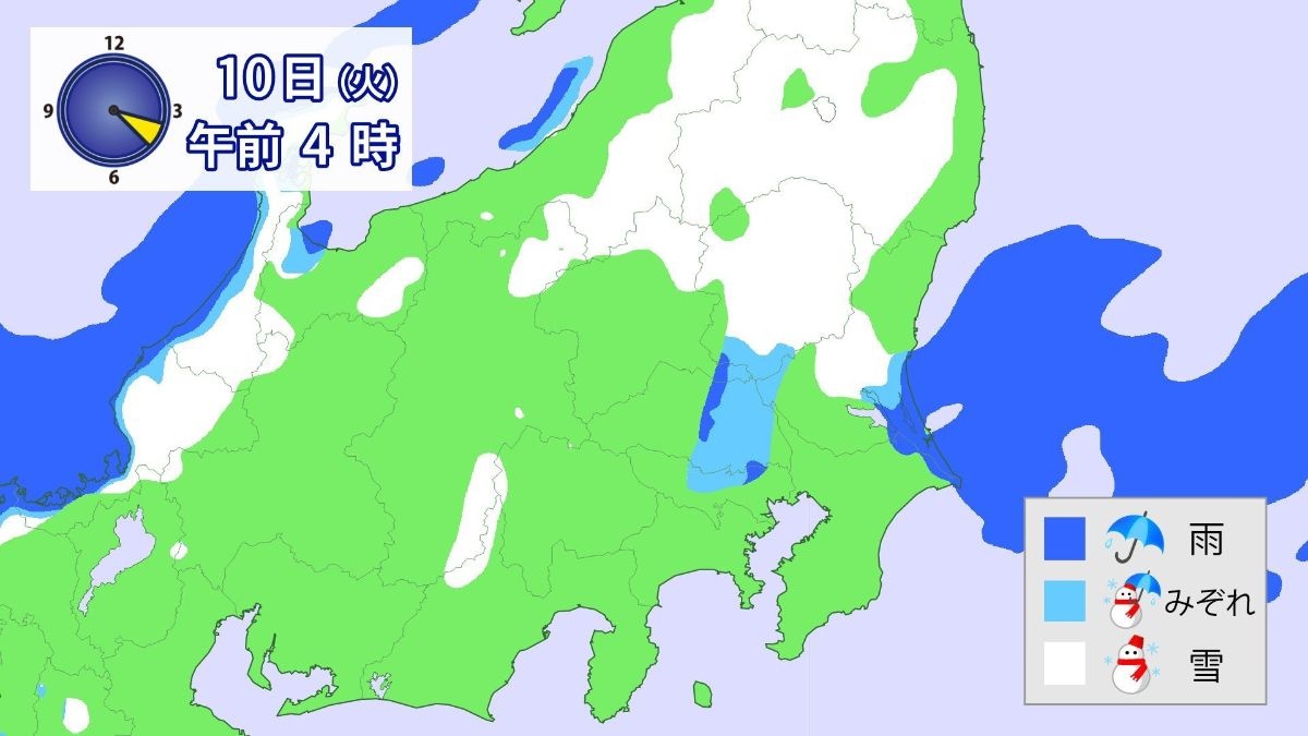 このため、10日(火)未明から朝にかけて、関東地方北部の平地では大雪となる所があるでしょう。