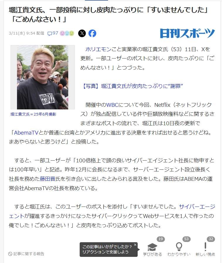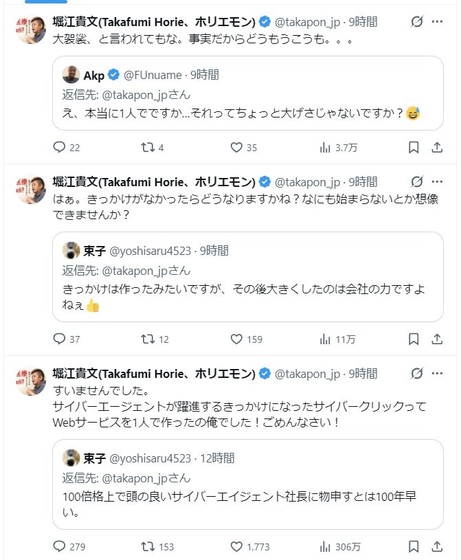 ホリエがアメリカに生まれてたらイーロンみたいになってたと思う 割とガチで 日本は足を引っ張る奴が多過ぎなのと皇室を頂点とした上流が強過ぎる
