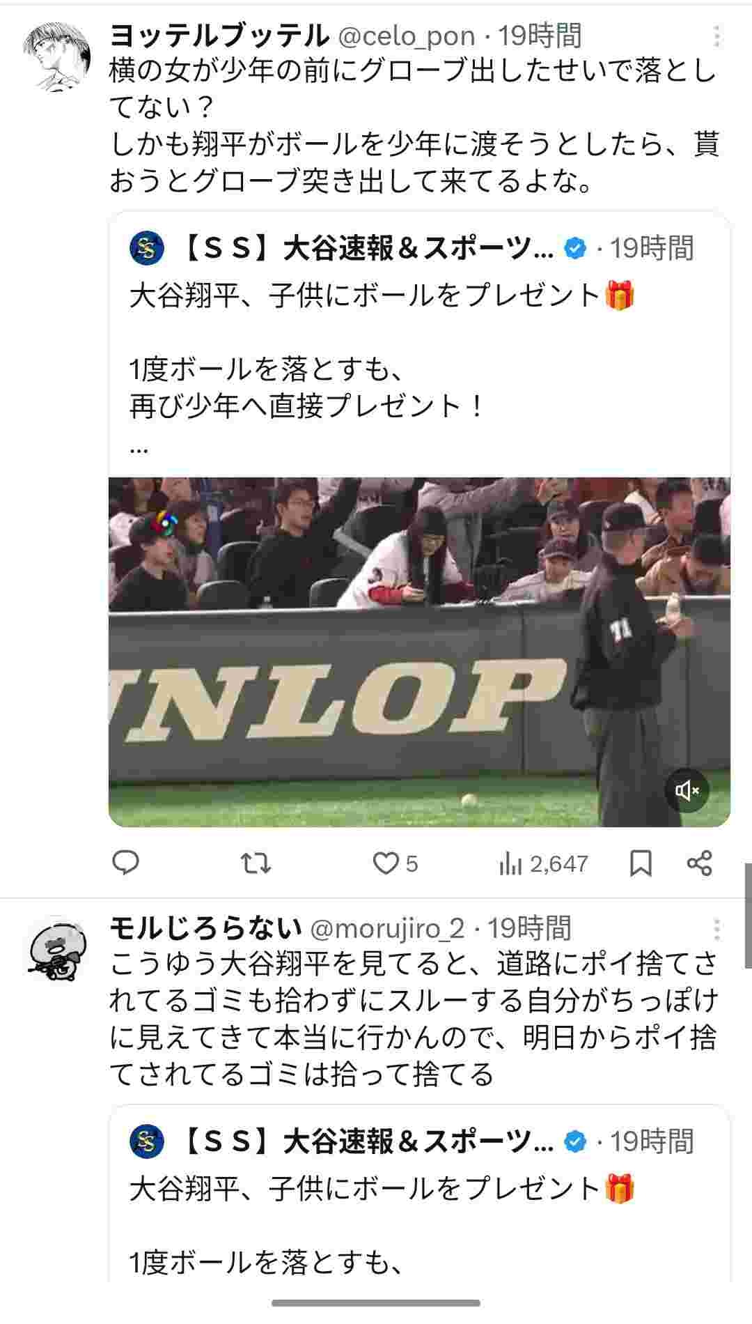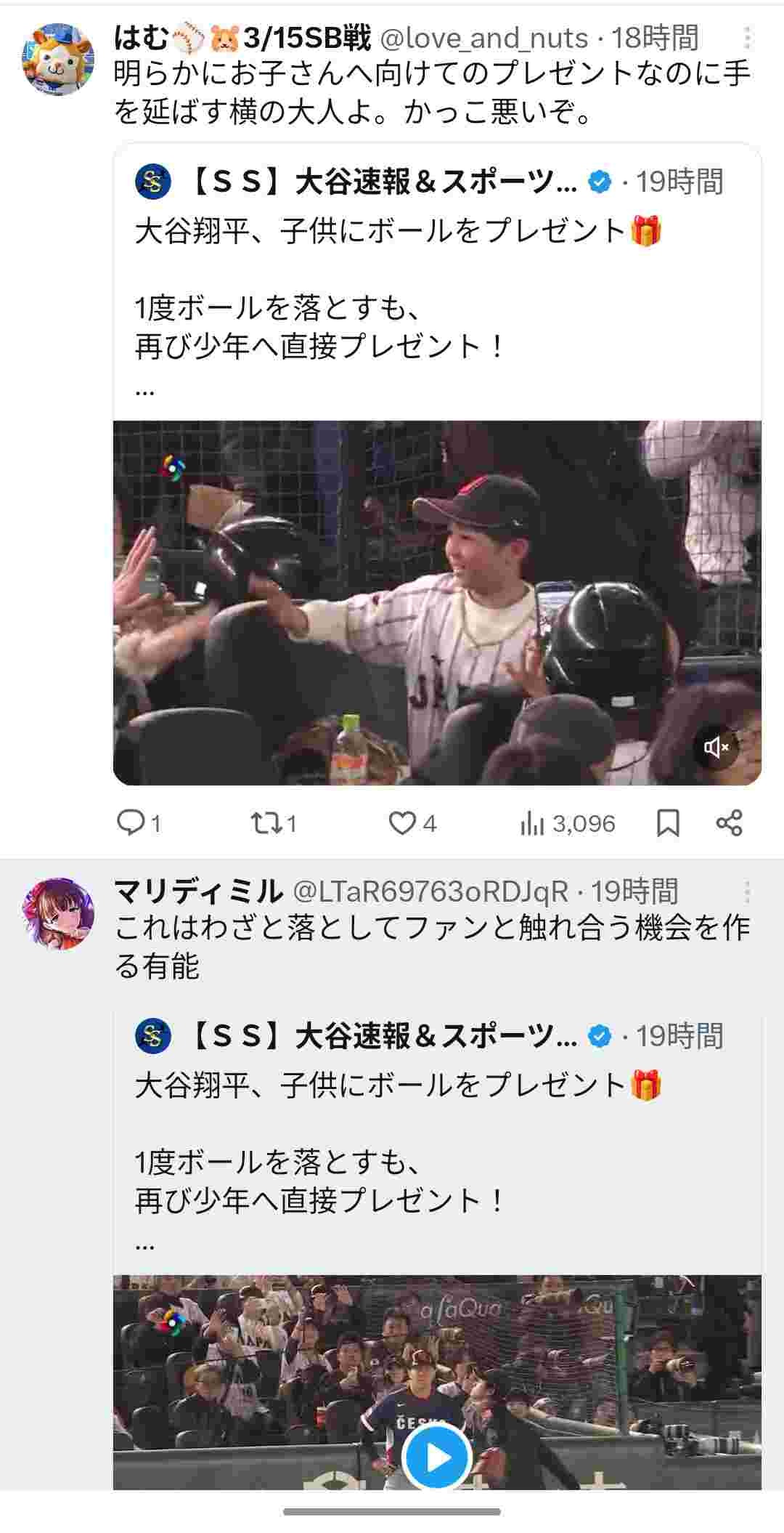いや画像みたら明らかに大谷は少年に渡してるんだが