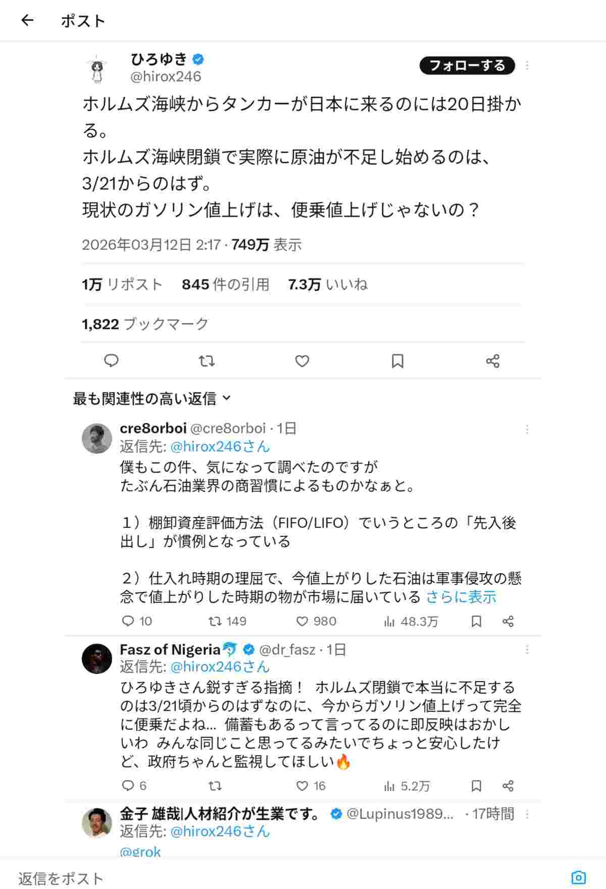 ひろゆきは「ホルムズ海峡からタンカーが日本に来るのには20日掛かる。ホルムズ海峡閉鎖で実際に原油が不足し始めるのは、3/21からのはず。現状のガソリン値上げは、便乗値上げじゃないの?」と疑問を呈した。