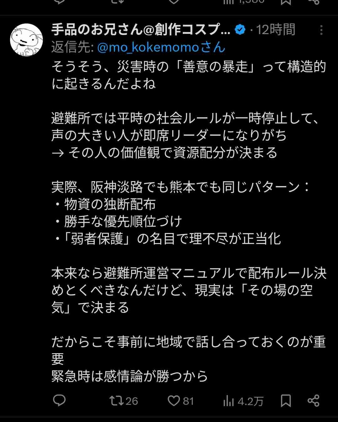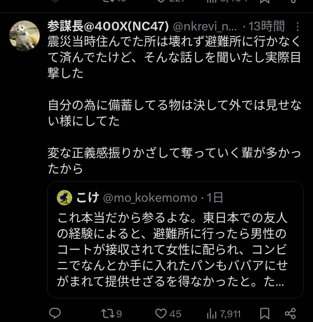 普段備えてた奴らと何もしてないやつで避難生活での格差があって当然なのに平等クソ喰らえ