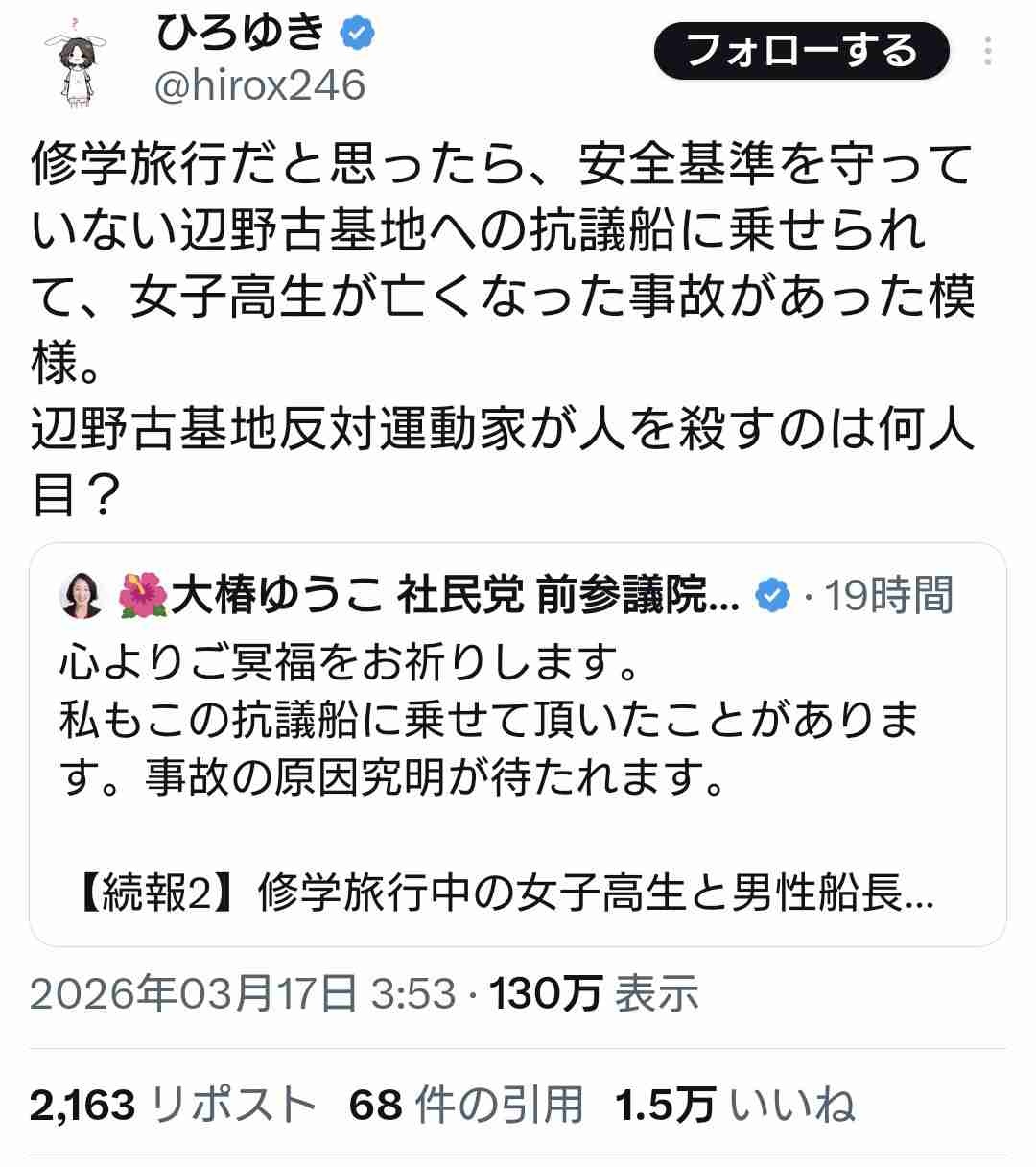 ひろゆき氏「辺野古基地反対運動家が人を56すのは何人目?」